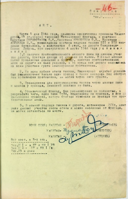Марта 5 дня 1944 года комиссия, назначенная приказом командира 93 отдельной танковой Житомирской бригады в составе: капитана ГОРНОСТАЕВА Ф. Я., капитана КРОПОТИНА Ф. И., капитана АПУШКИНА Н. И., расследовав причины подрыва танков 211 и 212 танковых батальонов в количестве 6 штук на дороге Онацковцы-Новая Лобунь при наступлении 4 марта 1944 года, установила: