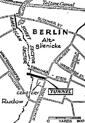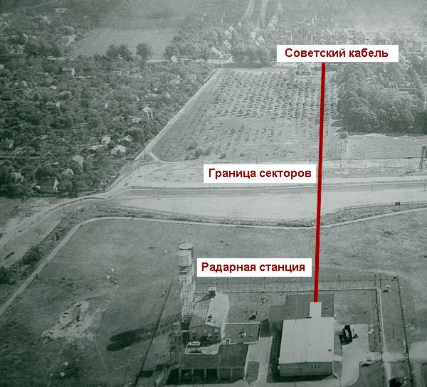 Ночью 22 апреля 1956 г. советские связисты, «осуществляя срочный ремонт» телефонного кабеля, обеспечивающего связь между Восточным Берлином и Москвой, «случайно» наткнулись на ответвление. Аккуратно сплетенные в пучки отводные провода были вставлены в свинцовые оболочки и протянуты через деревянную перегородку в лаз, круто уходящий в землю, а оттуда через две стальные двери в обложенный прочной стальной трубой около двух метров в диаметре тоннель, ведущий в сторону границы, разделяющей советский и американский секторы Берлина.