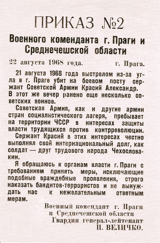К середине дня практически без сопротивления все основные административные и транспортные узлы Чехословакии были заняты солдатами армий Варшавского договора. Войскам дан приказ блокировать казармы армии Чехословакии, в случае сопротивления действовать по обстановке. Но сопротивления не было вообще. Не нашлось ни одного офицера, который поднял бы своих солдат в бой.
