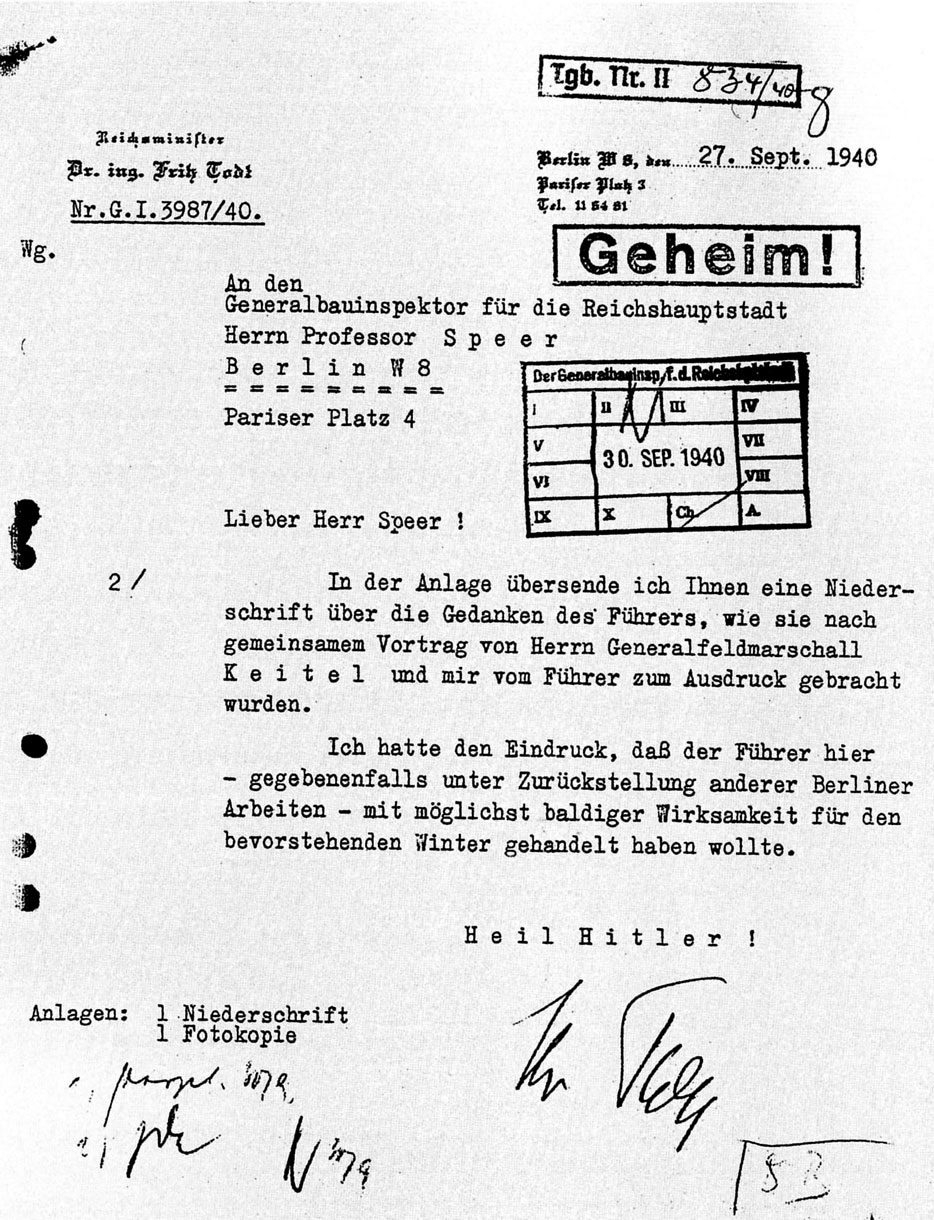Шпееру понадобилось лишь три дня, чтобы сориентироваться в ситуации и по-новому организовать работу Главной строительной инспекции (GBI). Письмо Гитлера открывало перед ним огромные возможности. Шпеер имел право получать беспрепятственно все необходимое для осуществления программы: рабочих, стройматериалы, транспортные средства, но, что еще важнее, принятые генеральным инспектором строительства решения являлись окончательными. На расширенном заседании 17 октября 1940 г. было решено, что первые бункеры в Берлине должны быть построены уже через три месяца.