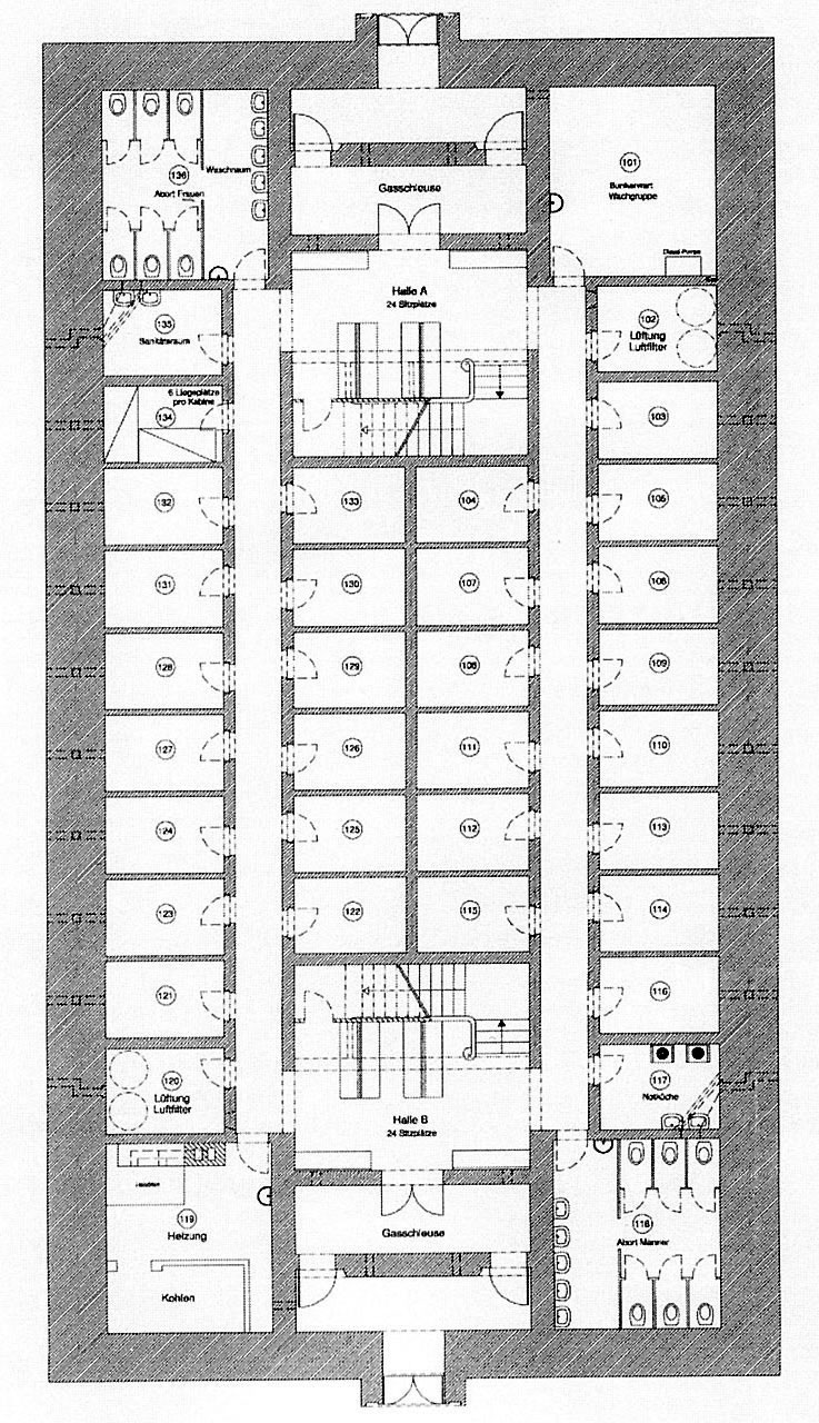 Ответственным был дежурный по бункеру. С 19 часов бункер закрывался. В бункере были туалеты и моечные для мужчин и женщин, кухня на случай необходимости, а также помещение для дежурной группы и ответственного за бункер. На каждом этаже в вестибюле было 27 сидячих мест. В самых маленьких 6-метровых кабинах стояли одна или две двухэтажных кровати с соломенными матрацами. В больших 9-метровых кабинах находились три двухэтажные кровати, маленький столик и два стула...