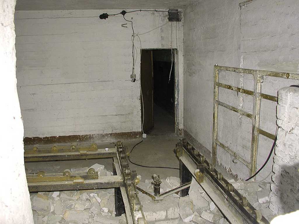 В семидесятых же годах этих плит с отверстием не было. На этом месте располагался прикрытый решеткой и закрытый на замок двустворчатый люк. Откинув в стороны створки люка, можно было по ступеням спуститься к двери, ведущей в тоннель.