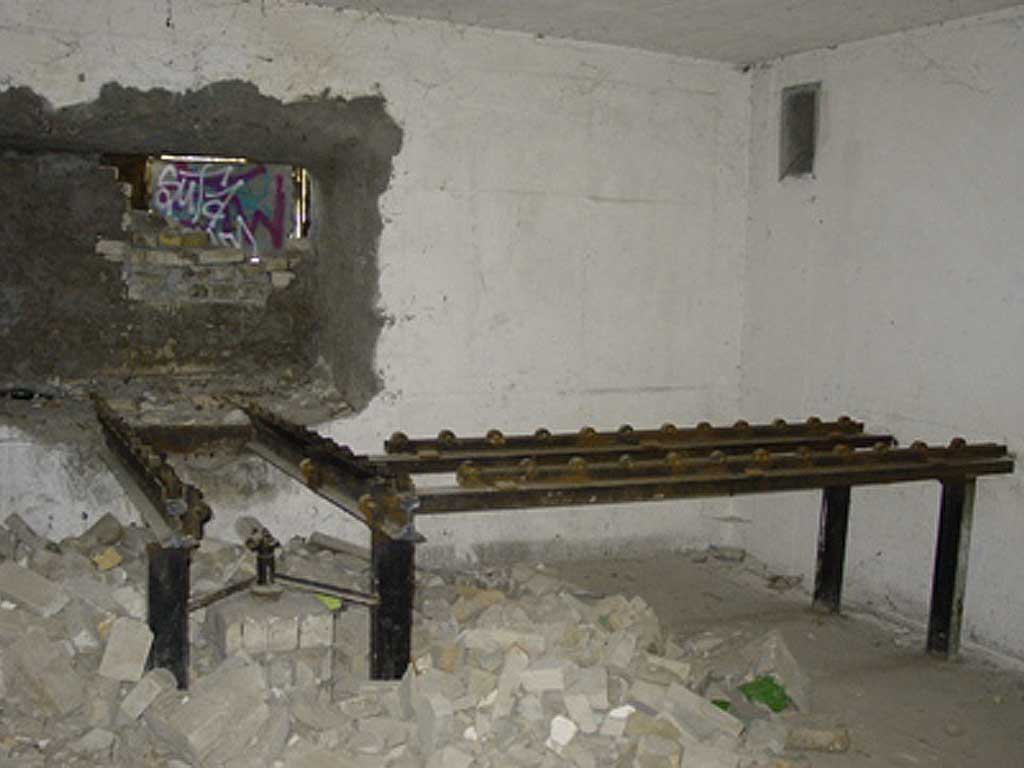 Все оказалось просто — этот роликовый транспортер соорудили из подручного материала батальонные умельцы для более удобной загрузки продуктов в склад. Причем отверстие в стене бункера долбили очень долго и проделали с величайшим трудом. Бетон оказался на редкость прочным и откалывался лишь маленькими кусочками.
