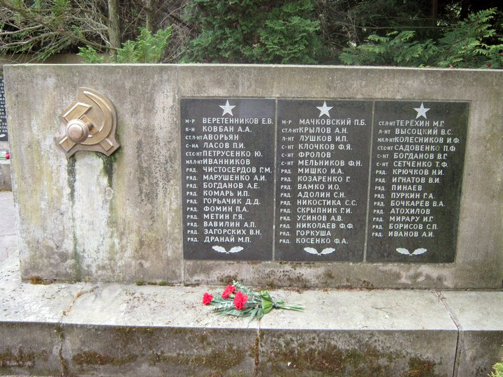 | (11 из 15) К шести бетонным стелам (по три с каждой стороны памятника) прикреплены мраморные доски, на которых высечены имена погребенных здесь советских воинов. Из архива В. В. Толстых. © |