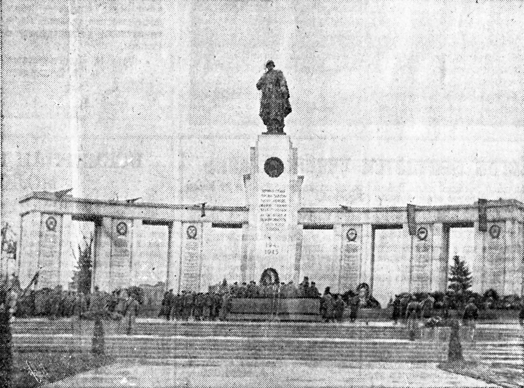 За Бранденбургскими воротами раскрылось широкое полотно шоссе, которое немцы называли «Аллеей побед». В трехстах метрах от развалин рейхстага возвышается монументальное сооружение — памятник советским воинам-героям, павшим в боях за Берлин.