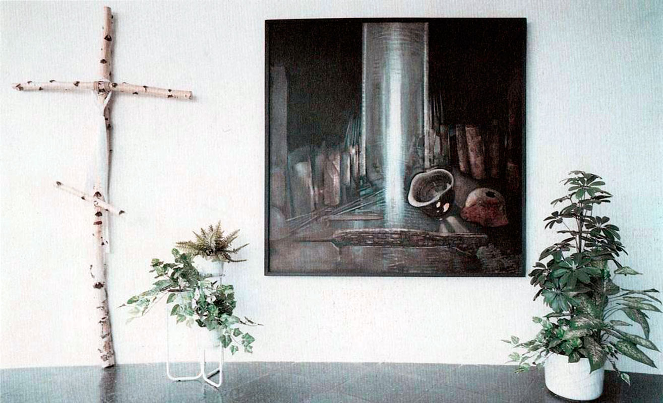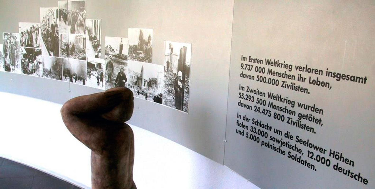 После объединения Германии и последовавшим за этим выводом советских войск началась коренная модернизация прежней просоветской экспозиции. В рамках новой парадигмы теперь основной упор делался не на величие подвига Красной Армии, а на расплывчатый тезис о том, что жертвы и страдания выпали на долю всех сторон, участвовавших в войне. Процесс переосмысления завершился к пятидесятилетию сражения за Зееловские высоты открытием 23 апреля 1995 г. новой постоянной экспозиции. Прежде всего коренным образом был изменен дизайн фойе, где со стены исчезли фамилии Героев Советского Союза. Вместо них появились фотографии, рассказывающие об ужасах Второй мировой войны. Далее следовал пояснительный текст, содержащий привычные и ничем не подтвержденные измышления про 33 тыс. советских и 5 тыс. польских солдат, якобы погибших при штурме Зееловских высот.18 Все это украшал установленный здесь же непонятный аляповатый истукан работы Д. Гржимек под названием «Торс». Также в фойе появилась картина Г. Нойбауэра «Голгофа», рядом с которой зачем-то поставили березовый крест. Чьё воспаленное воображение привело к воплощению таких, мягко говоря, неоднозначных дизайнерских решений, автор выяснять не стал. По информации ряда источников в таком виде выставка просуществовала до 2012 г.