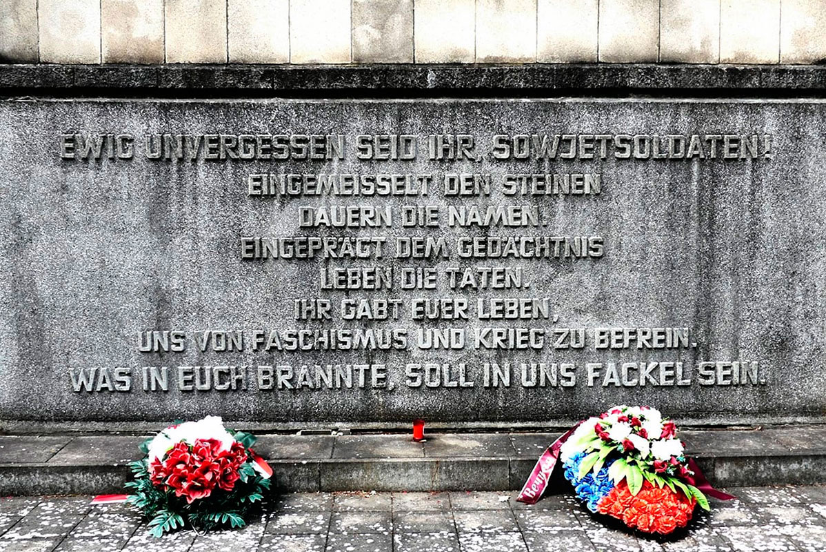 Также в 1977 г. на фасаде главной лестницы, ведущей от захоронений к подножию монумента, появилась мемориальная доска. На доске размещен немецкий текст, выполненный накладными буквами, — стихи немецкого поэта Г. Прейслера: «Вы никогда не будете забыты, советские солдаты! Имена высечены в камне. Подвиги запечатлены в памяти. Вы отдали свою жизнь, чтобы избавить нас от фашизма и войны. Огонь, горевший в вас, должен воспылать факелом в нас!». Площадка перед лестницей использовалась для возложения венков. Тут принимали в пионеры юных тельмановцев, регулярно проводил свои торжественные мероприятия Союз свободной немецкой молодежи (FDJ), а воины Национальной Народной Армии ГДР принимали здесь присягу.