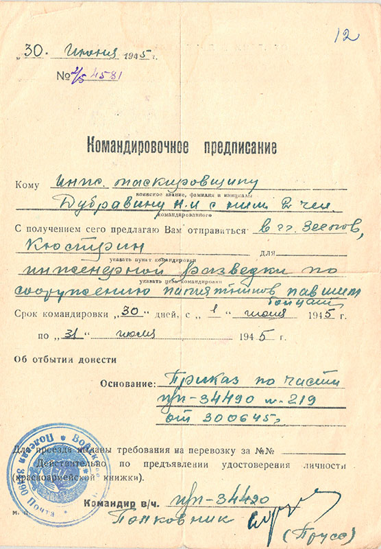 На основании приказа Штаба Группы от 16.11.45 года для участия в церемониале при открытии памятников в г.г. КЮСТРИН и ЗЕЕЛОВ воинам Красной Армии, павшим в боях за свободу и независимость нашей Родины