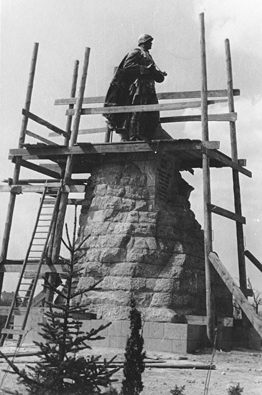 Что касается выполнения скульптурных работ, с самого начала было ясно, что в установленные сроки уложиться не получится. Поэтому, как и в случае с Тиргартеном, было решено изготовить к открытию покрытую бронзовой краской гипсовую копию. Как свидетельствуют документы из архива фирмы «Ноак», выполнявшей все литейные работы для советских мемориалов, гипсовая фигура была заменена на бронзовую лишь следующей весной. Отливка бронзовой фигуры была поручена мастерской в Лауххаммере.5