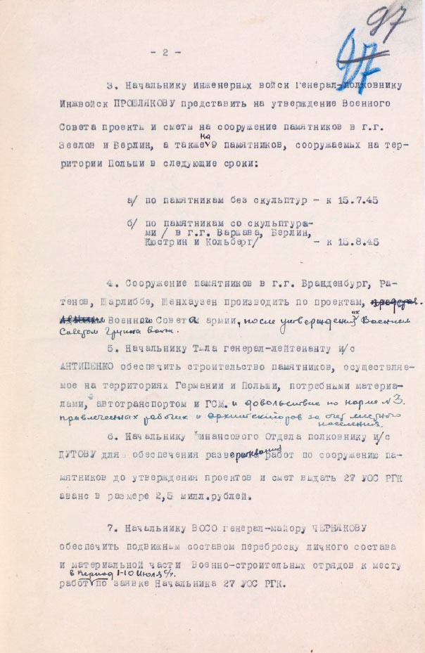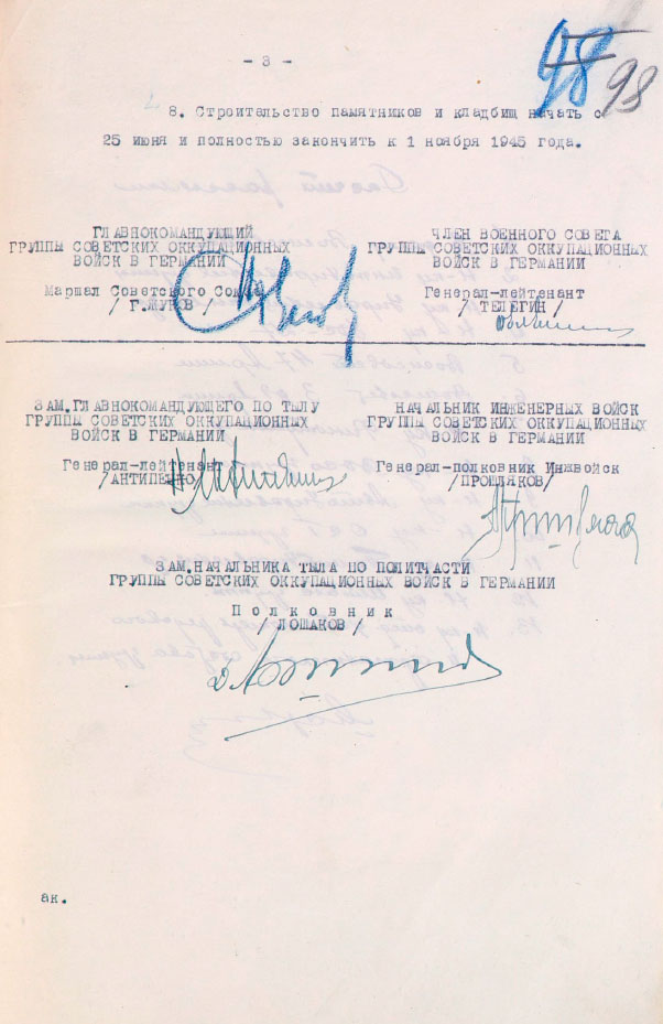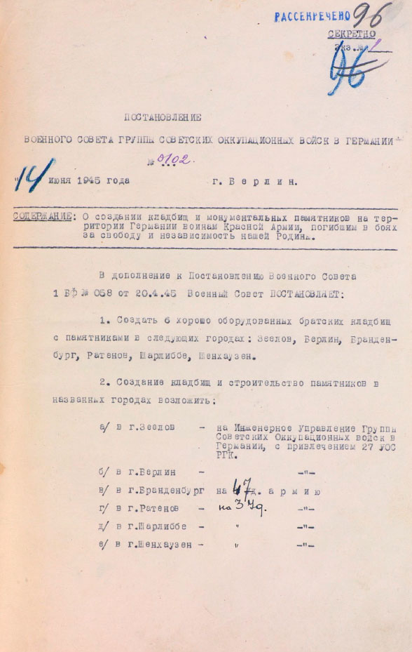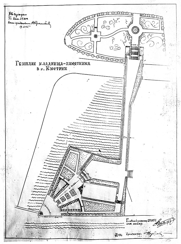 Действительно, изначально предполагалось создание в Берлине хорошо оборудованного братского кладбища с памятником. При этом проект и смету на сооружение памятника необходимо было представить Военному Совету на утверждение к 15 августа 1945 г. Однако это постановление в части кладбища выполнено не было. По всей видимости в конечном итоге было принято решение о строительстве в Берлине одного лишь памятника (без кладбища), что мы фактически и наблюдаем, хотя в наши головы настойчиво продолжают внедрять тезис о двух с половиной тысячах погребенных.