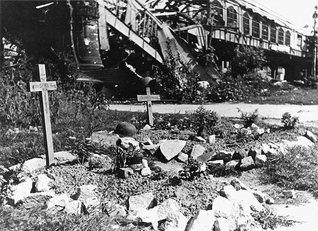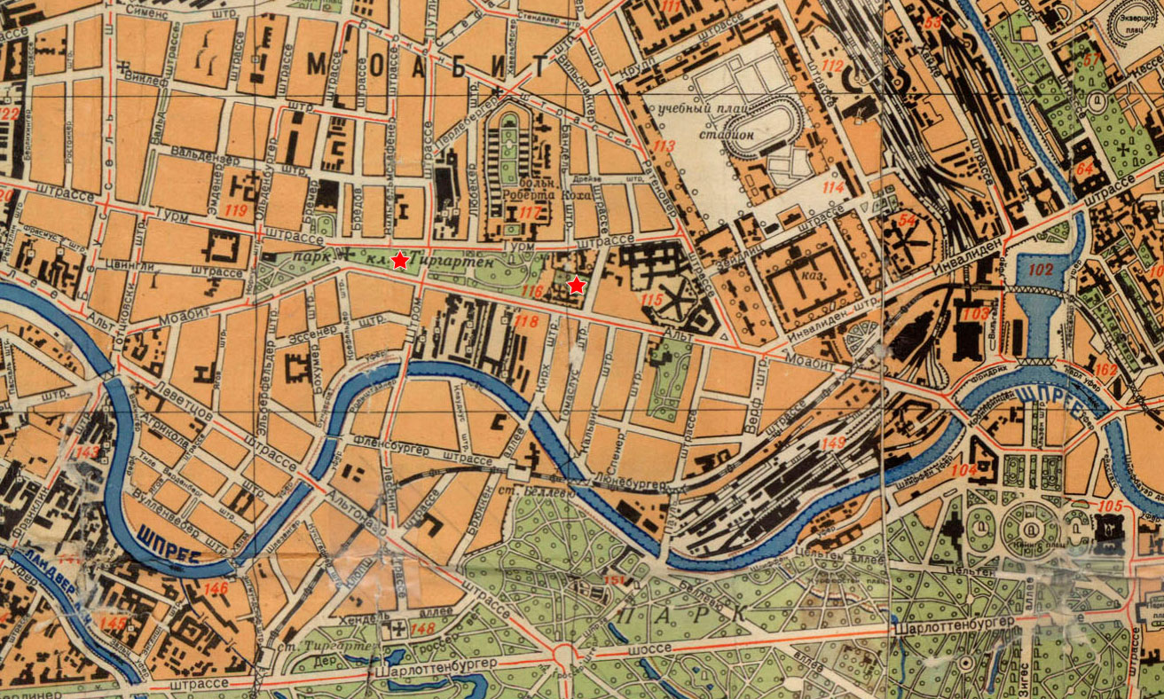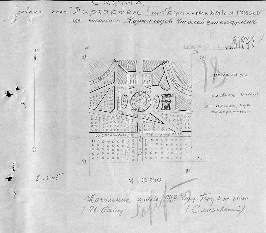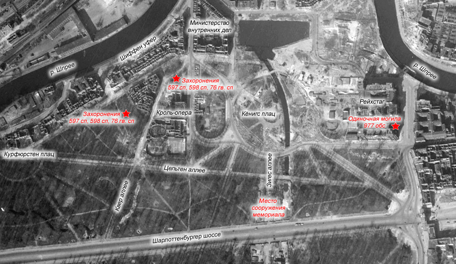 Этот отрывок косвенно подтверждает, что в июне 1945 г. кладбища в Тиргартене не существовало. Ведь, если предположить, что территория будущего мемориала использовалось, как место погребения советских солдат, то тогдашнему советскому коменданту Тиргартена не было смысла хлопотать о сооружении еще одного кладбища фактически рядом с уже действующим (дворцовый парк Бельвю расположен всего в километре к западу от рейхстага). Впрочем, могилы красноармейцев в Тиргартене все же были. Например, в парке Малый Тиргартен и на кладбище на Вильснаккерштрассе (недалеко от тюрьмы Моабит, на плане Берлина они обозначены звездочками). Эти захоронения просуществовали там как минимум до 1947 г.