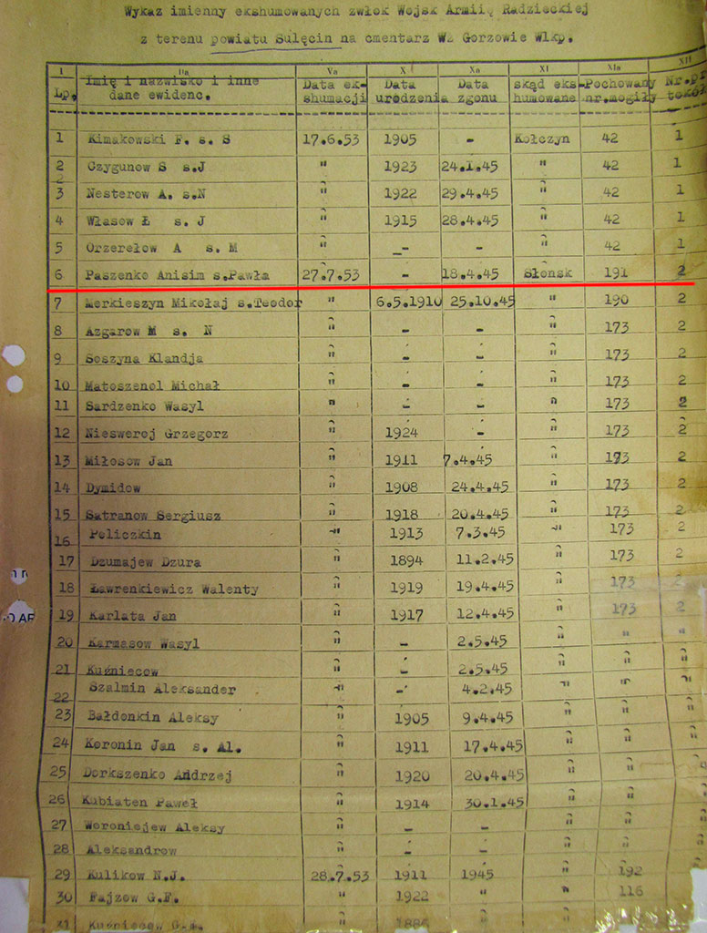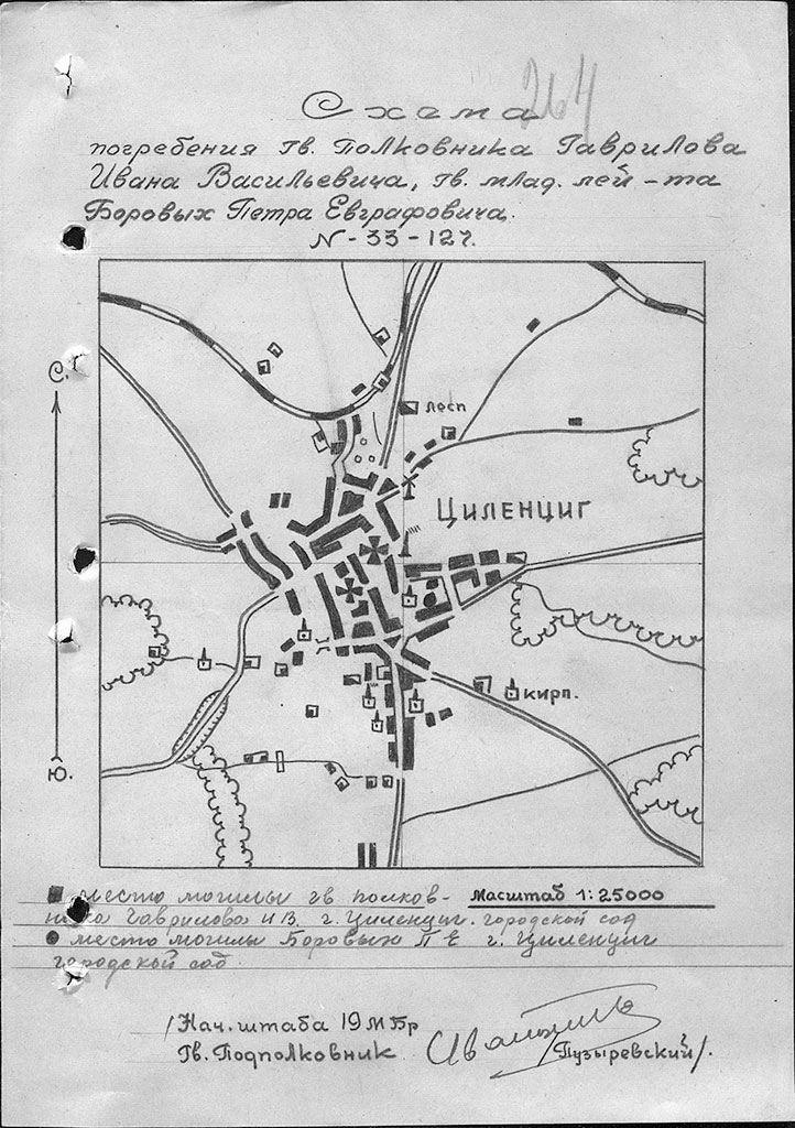 А если предположить, что и И. В. Гаврилов был похоронен отнюдь не в Тиргартене, а совсем в другом месте? Смотрим уже знакомый список — и удивляемся: под № 9 списка (как раз перед фамилией А. М. Темника) значится фамилия И. В. Гаврилова, 1899 г. рождения! Не слишком ли много совпадений? То, что эксгумация проводилась в Любже, а не по месту первичного погребения в Суленцине (Циленциг), смущать не должно. В Польше, как и во многих других местах, погибших воинов на мемориалы зачастую переносили повторно. Уже в 1946 г. существовала практика укрупнения захоронений: из разбросанных по множеству деревень индивидуальных и братских могил останки переносили на так называемые дивизионные кладбища, откуда впоследствии их перезахоранивали на специально созданных крупных мемориальных комплексах (еще в мае 1945 г. на территории Польши началось строительство одиннадцати таких мемориальных кладбищ). Впрочем, как будет показано чуть позже, перенос чьих-либо останков с территории Польши в Берлин вообще вряд ли был возможен. А вот похоронить в одном месте трех комбригов-героев, воевавших плечом к плечу в составе одного корпуса — такую мысль, если она возникла у командования, надо признать логичной. Тем более, что Любжа и Суленцин (Либенау и Циленциг) расположены менее, чем в 40 км друг от друга.