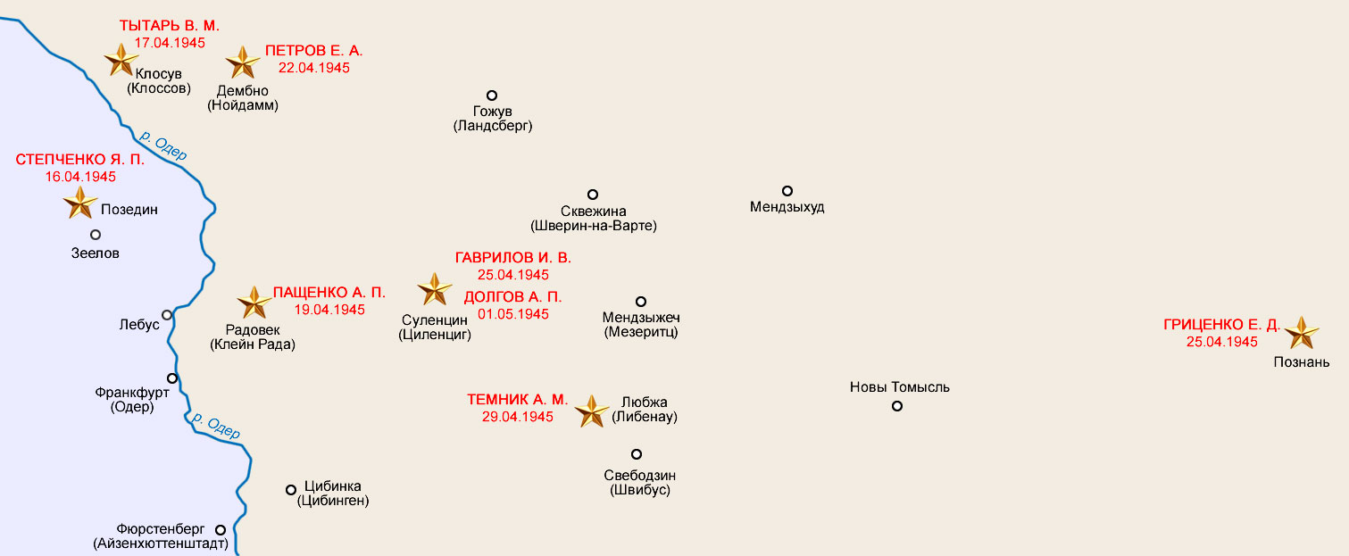 На приведенной ниже схеме обозначены места первичного захоронения всех (за исключением Н. В. Кузнецова) Героев Советского Союза, чьи имена увековечены на тиргартенских саркофагах. Сразу бросается в глаза, что все они, кроме Я. П. Степченко, были изначально похоронены за Одером. Могло ли командование ГСОВГ в первые послевоенные месяцы организовать командировки за Одер с целью перенесения чьих-либо останков в Тиргартен? Вероятность такого развития событий чрезвычайно мала по ряду объективных причин.