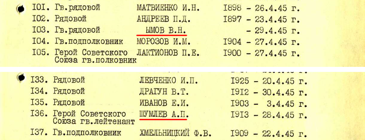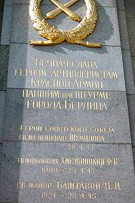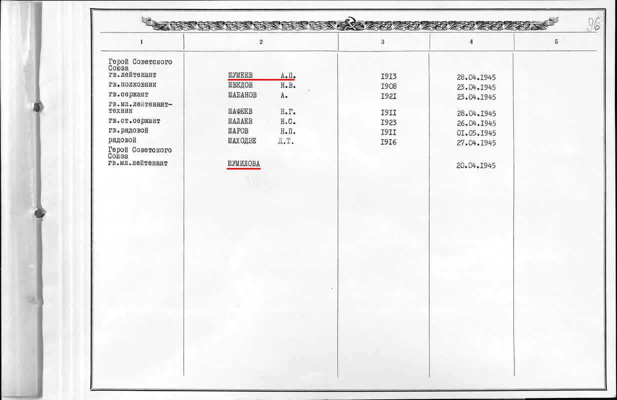 В результате несложной проверки выясняется, что в списках лиц, удостоенных звания Героя Советского Союза, гв. мл. лейтенант Шумилова не значится. Единственная женщина с такой фамилией — мл. лейтенант мед. службы Шумилова — никакого отношения к штурму Берлина не имеет, поскольку умерла от болезни еще в феврале 1945 г. Все указывает на то, что в данном случае в спешке умудрились перепутать не только фамилию, но и пол. Под исходные параметры подпадает лишь Герой Советского Союза гв. лейтенант Шумелёв Александр Прокопьевич, командир огневого взвода 1645-го легкого артиллерийского полка. Кстати, в списке Белоцерковского (о нем речь впереди) увековеченная на пилоне мл. лейтенант Шумилова отсутствует, вместо нее фигурирует как раз Шумилов А. Однако здесь есть нюанс. Согласно именному списку потерь офицерского состава частей 6-го гв. танкового корпуса он не погиб, а пропал без вести 19 апреля 1945 г. в районе г. Барут. Поэтому не совсем понятно, чье имя изначально хотели поместить на памятник скорые на руку увековечиватели. Пока же на пилоне красуется фамилия вымышленной героини.