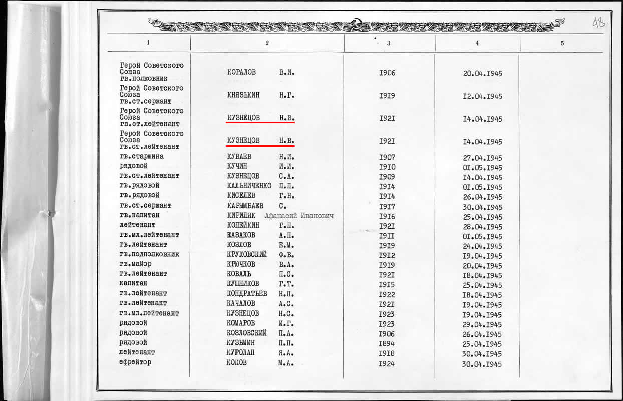 Что же касается места первичного захоронения, то в майском донесении штаба 9-го штурмового авиакорпуса в списке потерь за апрель 1945 г. касательно Н. В. Кузнецова в графе «где похоронен» прямо указано: дальнейшая судьба неизвестна. При таком раскладе его прах никак не мог быть перезахоронен в Тиргартене.