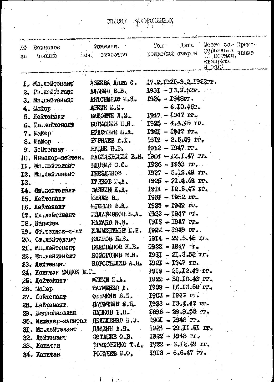 - Донесение со списками офицеров, захороненных на территории СГВ и ГСОВГ от 31.01.1948 г.. – ЦАМО, ф. 33, оп. 594260, д. 112, лл. 69-71.