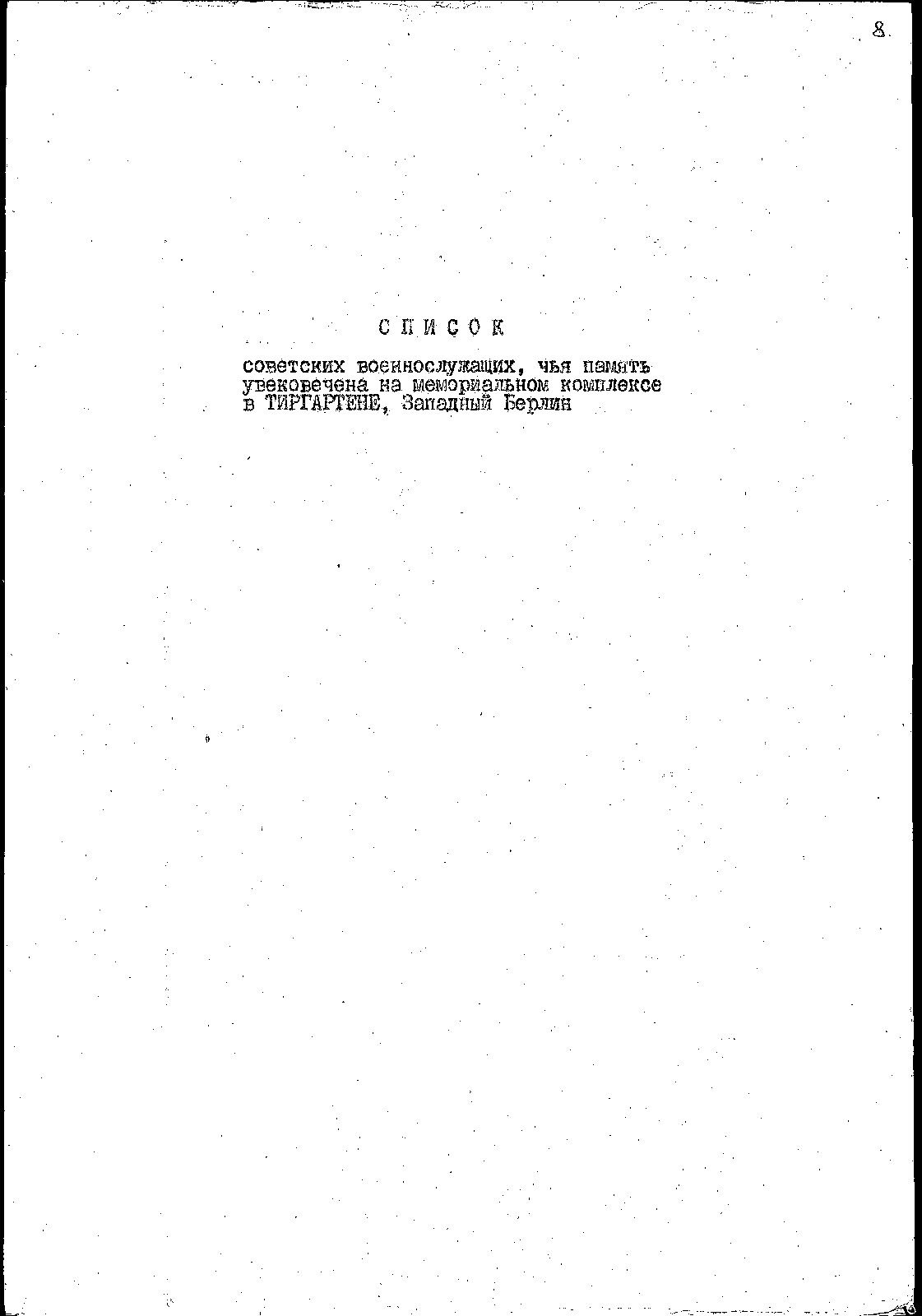 3. «Список советских военнослужащих, чья память увековечена на мемориальном комплексе в Тиргартене, Западный Берлин», причем документов с таким названием удалось найти даже два — один предположительно составлен в 1980-е годы (в нем имеется снимок мемориала примерно этого периода); другой более поздний, датирован 2001 г.
