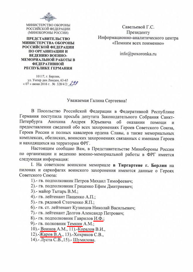 Несомненно, найдется немало оппонентов, которые постараются обвинить автора в предвзятости. Мол, легко рассуждать, сидя на диване и так далее в том же духе. Что ж, рассмотрим образец канцелярского творчества профессионалов, появившийся совсем недавно, в июне 2016 г. В Представительство министерства обороны РФ по организации и ведению военно-мемориальной работы в ФРГ поступил запрос с просьбой предоставить сведения о Героях Советского Союза, похороненных в Германии. На этот запрос был получен официальный ответ. Солидный штамп в левом верхнем углу указывает на то, что документ создан серьезными людьми в комфортном кабинете с кондиционером и видом на Унтер-ден-Линден. И подписан он не «диванным экспертом», а профессионалом, да еще со степенью кандидата исторических наук. Полностью его можно почитать здесь, мы же ознакомимся лишь с первой страницей документа.