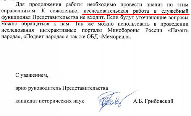 Вот так. Представительство оборонного ведомства по военно-мемориальной работе в Германии исследовательской деятельностью не занимается. Следовательно, ошибки на памятнике в Тиргартене исправляться не будут, как не будет проверяться и наличие захоронений. Чтобы исправить на памятнике хотя бы запятую, необходимо разрешение Представительства. Представительству, естественно, нужны доказательства. Как следует из ответа, само оно искать их не будет — не представительское это дело. Но, даже, если доказательства будут предъявлены, вам вежливо разъяснят, что необходима тщательная их проверка, то есть проведение той самой исследовательской работы, которой специалисты военно-мемориальных дел в Германии не занимаются по умолчанию. Круг замкнулся.