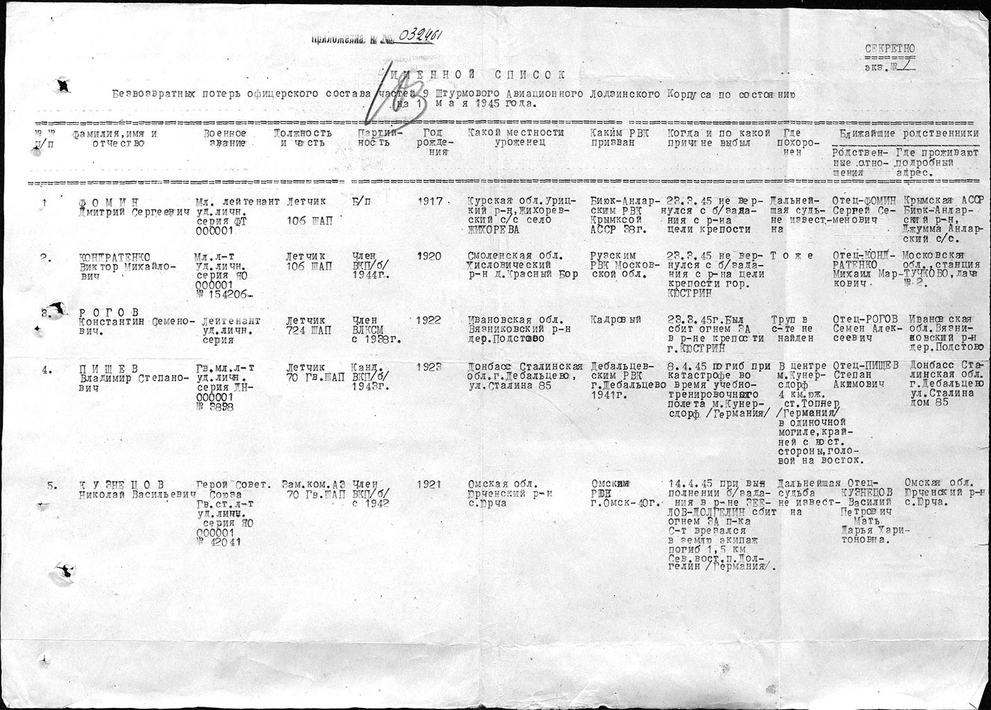 - Именной список безвозвратных потерь офицерского состава частей 9 шак на 01.05.1945 г.. – ЦАМО, ф. 33, оп. 11458, д. 799, л. 103.