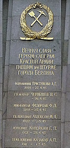 Здесь мы натыкаемся и на такой неоднозначный момент. Как вспоминал в 1989 г. один из главных создателей мемориала А. И. Краснобаев, в строительстве принимал участие майор К. Д. Федорцов, брат которого, инженер-капитан Ф. Д. Федорцов, погиб в последний день войны, и его фамилиия есть на памятнике. Что и говорить, красивая история. И ведь действительно, прямо над фамилией М. Я. Ицексона находим фамилию Ф. Д. Федорцова. Только вот дата гибели... Явно же не последний день войны. Более того, выясняется, что и дата смерти 25 апреля не соответствует действительности. В именном списке офицерского состава, умершего от ран в госпиталях МЭП-14, указано, что помпотех 68 военно-строительного отряда Ф. Д. Федорцов получил ранение 24 мая 1945 г. и 30 мая скончался в госпитале. Автор ни в коем случае не подвергает сомнению боевые заслуги Ф. Д. Федорцова, но согласитесь, смерть 30 мая не вполне сообразуется с надписью на пилоне во славу героев-саперов, погибших при штурме Берлина.
