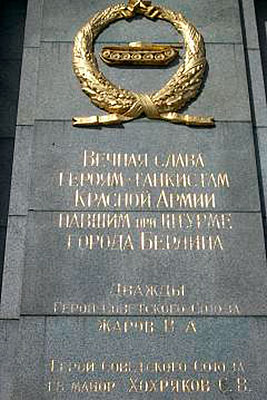 Впрочем, на памятнике можно увидеть и не такое. К примеру, на одном из пилонов с именами танкистов увековечен рожденный чьей-то неудержимой фантазией дважды Герой Советского Союза В. А. Жаров. Откуда взялся этот сказочный персонаж, чьими стараниями и с какого потолка надпись перекочевала на памятник — никому доселе неведомо. Имеются данные на некоего гв. лейтенанта В. А. Жарова, командира огневого взвода 203-го гв. гаубичного артиллерийского полка 1-й гв. артиллерийской дивизии прорыва РГК. Но, во-первых, он ни разу не Герой Советского Союза, а, во-вторых, 29 апреля был ранен и благополучно эвакуирован в тыл. Показательно, что в этом и подобных случаях чиновникам-увековечивателям доказательства не нужны, поскольку могут разрушить устоявшийся за десятки лет привычный уклад. Действительно, зачем исправлять очевидный ляп, который смотрится на памятнике так убедительно, торжественно и красиво. И лишь один досадный штришок вносит смуту в эту ласкающую чиновный взор мемориальную благодать. Так уж вышло, что под фамилией виртуального Жарова увековечен (скорее, недоувековечен) абсолютно реальный дважды Герой Советского Союза гв. майор Хохряков Семен Васильевич, командир батальона 54-й гв. танковой бригады 7-го гв. танкового корпуса, награжденный второй Золотой Звездой по Указу ПВС СССР от 10 апреля 1945 г. Получить он ее не успел, потому что погиб в бою 17 апреля. И то, что он дважды Герой, на пилоне почему-то не отражено. Видимо, по мнению нынешних «увековечивателей» для внесения необходимых исправлений доказательная база все же слабовата.