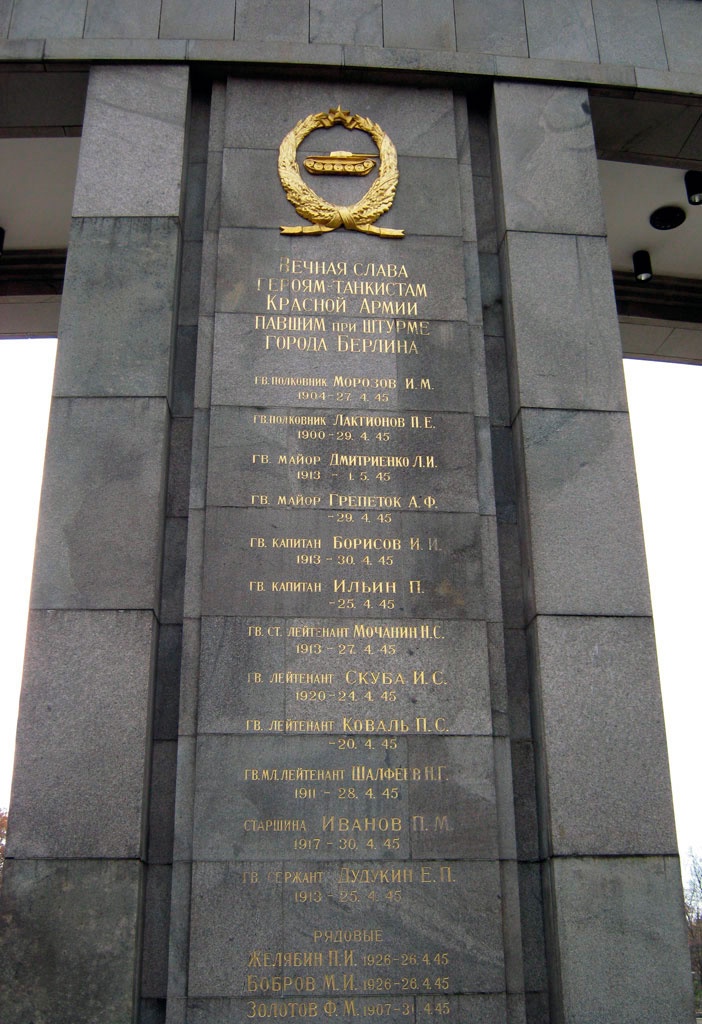 Заместитель командира 1-й гв. танковой бригады Морозов Иван Михайлович в действительности был подполковником. Командир 21-й гв. механизированной бригады гв. полковник Лактионов Петр Ефимович был смертельно ранен 26 апреля и скончался в госпитале на следующий день, а указанная на памятнике дата 29.04 — это день погребения. Гв. майор со странной фамилией Грепеток на самом деле — Гребенюк Андрей Федорович, 1909 г. р., ответственный редактор газеты «Боевой призыв» 6-го гв. танкового корпуса, погибший 28 апреля. Отсутствуют отчество и год рождения у гв. капитана Ильина — Ильин Павел Николаевич, 1916 г. р., ст. помощник начальника отделения связи 7-го гв. танкового корпуса. Выяснилось, что гв. ст. лейтенант Мочанин в действительности Мочалин Николай Семенович, командир батальона 27-й мотострелковой бригады 11-го гв. танкового корпуса, а гв. лейтенант Скуба — не кто иной, как Скиба Иван Семенович, командир самоходной установки ИСУ-122 из состава 399-го гв. тяжелого самоходного артиллерийского полка 11-го гв. танкового корпуса. Командир же ИСУ-122 384-го гв. тяжелого самоходного артиллерийского полка 7-го гв. танкового корпуса Коваль Павел Степанович родился в 1921 г. и в действительности погиб 18 апреля. И, наконец, неверно указаны инициалы гв. сержанта Дудукина, правильно — Дудукин Дмитрий Иванович, заряжающий 399-го тяжелого самоходного артиллерийского полка 11-го гв. танкового корпуса.