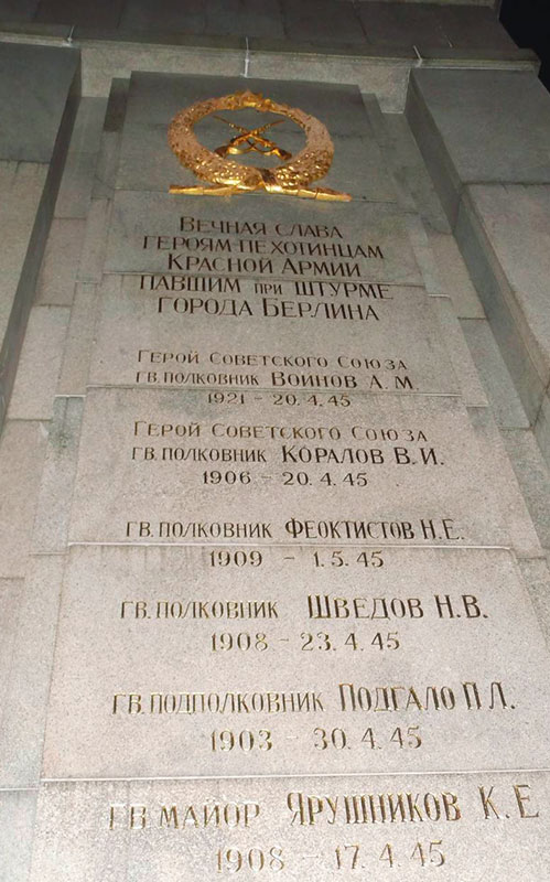 С Героем Советского Союза гв. полковником Войновым А. М. похожая ситуация. Согласно официальной справке ЦАМО такого офицера в Красной Армии никогда не было. Зато был гв. подполковник Воинков Александр Михайлович, командир 100-го гв. стрелкового полка 35-й гв. стрелковой дивизии. Он не успел стать Героем Советского Союза, хотя был внесен в предварительный список на представление к этому званию. Впрочем, уже то, что в свои неполных 24 года он стал подполковником и командовал гвардейским полком, говорит о многом. Кстати, его заместителем по артиллерии был В. И. Варенников, получивший в будущем огромную известность. Остается только гадать, каких высот мог достичь А. М. Воинков, если бы 20 апреля 1945 г. во время боя за Вальд-Зиферсдорф жизнь талантливого офицера-самородка не оборвала пуля вражеского снайпера. Через полчаса после гибели любимого командира полк в качестве прощального салюта произвел по противнику залп из всех видов оружия. И вот на протяжении уже многих лет его внуки безуспешно пытаются достучаться до чиновников всех рангов, пытаясь добиться разрешения исправить надпись на пилоне. Ответ стандартный: сожалеем, но сделать ничего нельзя, не хватает доказательств. То, что никакого Войнова никогда не было, а был Воинков, для чиновной братии доказательством не является. Факт, прекрасно иллюстрирующий отношение некоторых современных стряпчих к сохранению памяти о войне. Изуродовать имя настоящего героя — легко, увековечить память не-пойми-кого — запросто, здесь столоначальникам никакие доказательства не нужны. А вот исправить унизительную для всех нелепицу — нет! нельзя! не положено! Все-таки правильно говорят, что чиновники нужны не для изменений, а для того, чтобы все оставалось на своих местах. Исковерканные фамилии павших героев на памятнике в Тиргартене — прекрасное тому подтверждение.