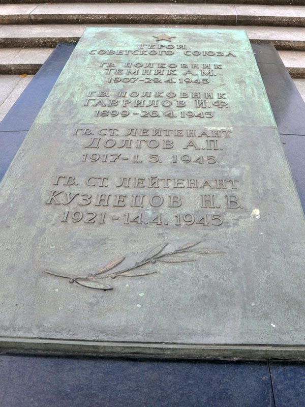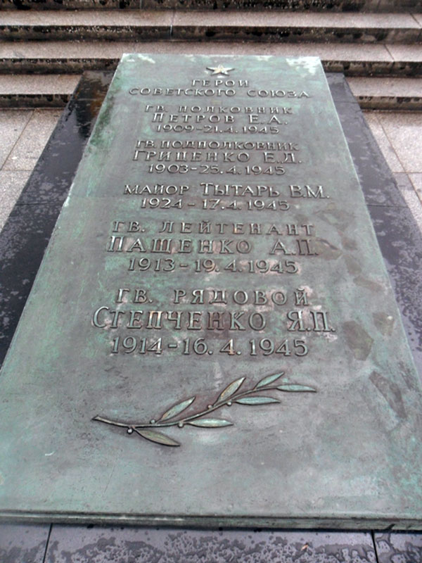 Всего на двух саркофагах увековечены фамилии девяти Героев Советского Союза, которые согласно легенде были здесь погребены при строительстве мемориала (четыре человека под западной плитой и пять человек под восточной). Среди них восемь офицеров и один красноармеец. Все они участвовали в штурме Берлина в составе войск 1-го Белорусского фронта. Шестерым из них звание Героя Советского Союза присвоено посмертно Указом ПВС СССР от 31 мая 1945 г., трое были удостоены этого звания ранее.