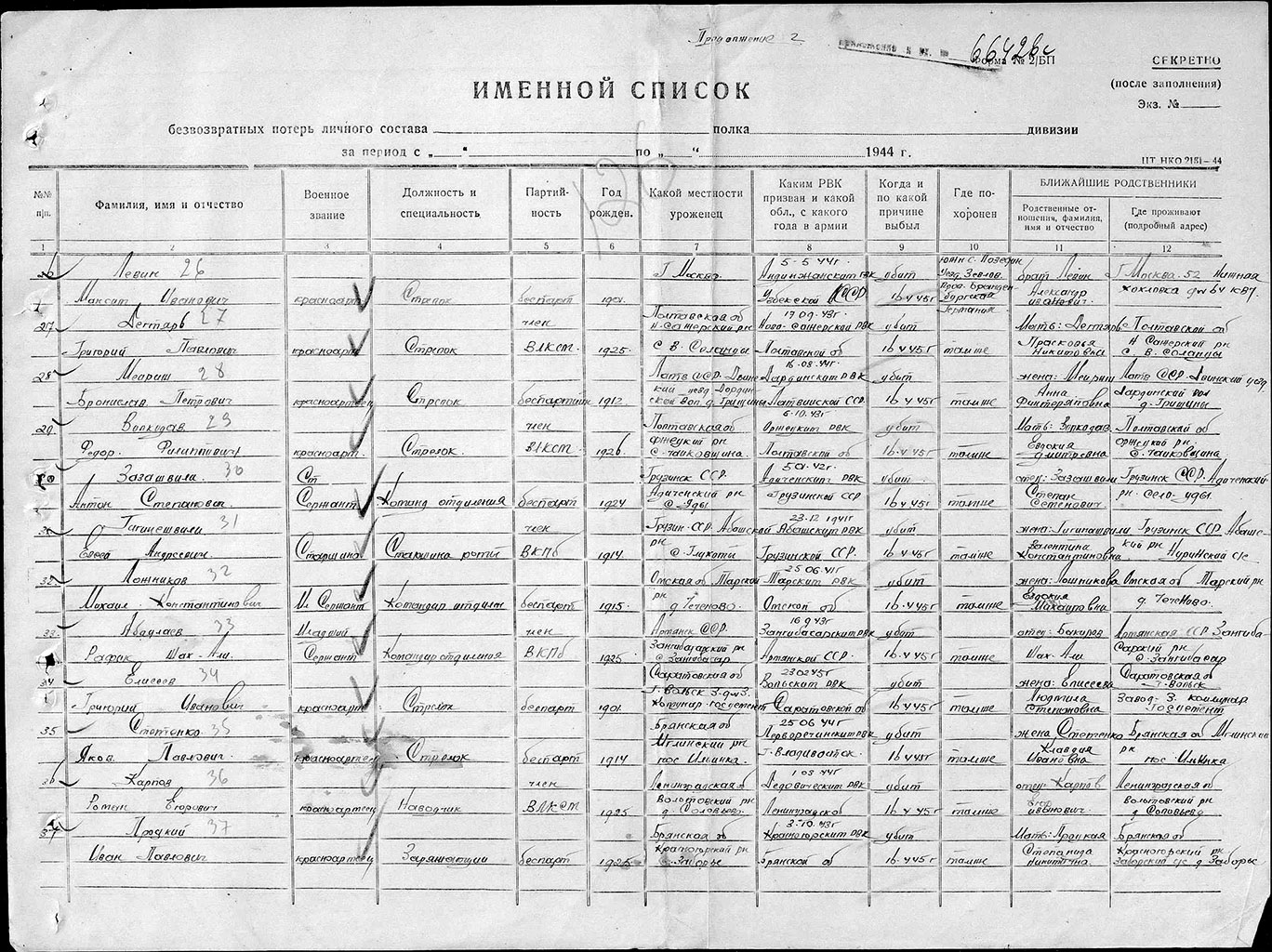 - Именной список на воинов Советской Армии, погибших во время штурма Берлина. – ЦАМО, ф. 33, оп. 594260, д. 112, лл. 36-41.
