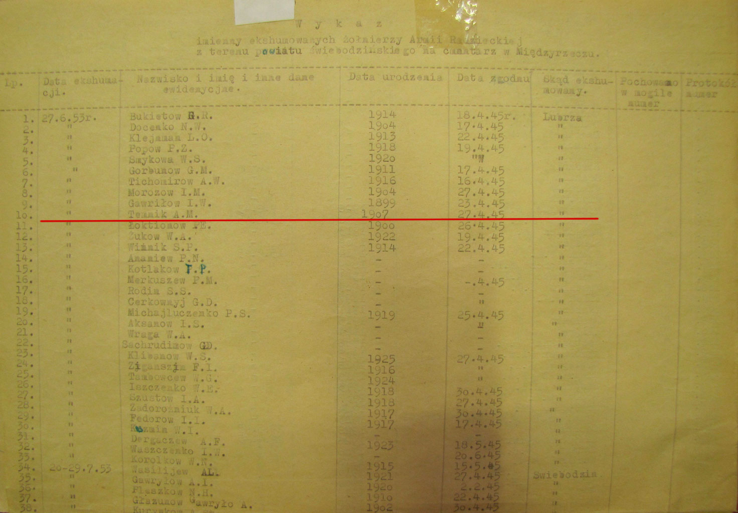 А теперь попытаемся понять, каким образом прах А. М. Темника оказался в Тиргартене. Версия, согласно которой останки были перенесены в Тиргартен из Либенау, выглядит правдоподобно лишь до тех пор, пока не ознакомишься с протоколом перезахоронения воинов Красной Армии на воинском мемориале в г. Мендзыжеч (Польша). В этом документе, составленном польской стороной и датированном сентябрем 1953 г., в списке имен тех, чьи останки 27 июня 1953 г. были эксгумированы в с. Любжа (бывший Либенау) под № 10 значится А. М. Темник, а следующей строкой указан П. Е. Лактионов. А под № 8 этого же списка значится погибший вместе с Темником его заместитель гв. подполковник И. М. Морозов. Вам не кажется, что версия о захоронении А. М. Темника в Тиргартене трещит по швам?