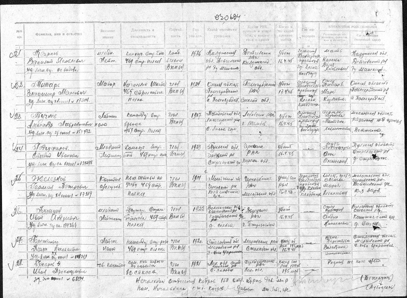 - Именной список безвозвратных потерь офицерского состава частей 150 сд 13-20 апреля 1945 г.. – ЦАМО, ф. 33, оп. 11458, д. 788, л. 14-об.