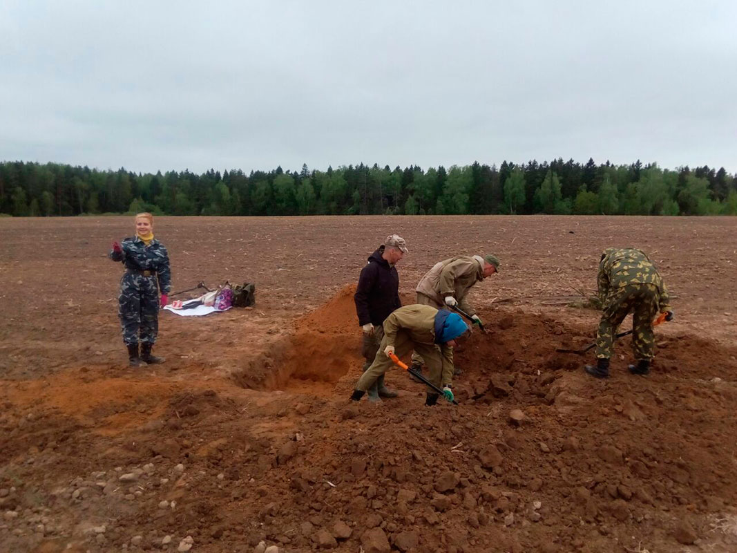 В поле на восточной окраине д. Еремино металлоискатель дал сигнал наличия металла. Сделали шурф над местом сигнала и наткнулись на фрагменты черепа человека. Сначала расширили квадрат до 1,5 м. По грунту определили, в каком месте располагается воронка, расширились, сделали археологический стол. На глубине от 30 см стали касаться останков солдат. Было понятно, что боец не один. Постепенное снятие ножом и кистью земли — работа очень кропотливая, долгая и трудная. С этой задачей успешно справились. Особенно отличились наши девушки Света и Аня Васичевы, Наташа Хренова. К концу первого дня удалось полностью вскрыть захоронение, которое предположительно является санитарным сбросом в воронку. Источником сигнала служили каска и саперная лопатка. До завершения работы мы «сняли» двух бойцов— очистили, сфотографировали, выложили на банер, а потом уложили индивидуально в мешки.