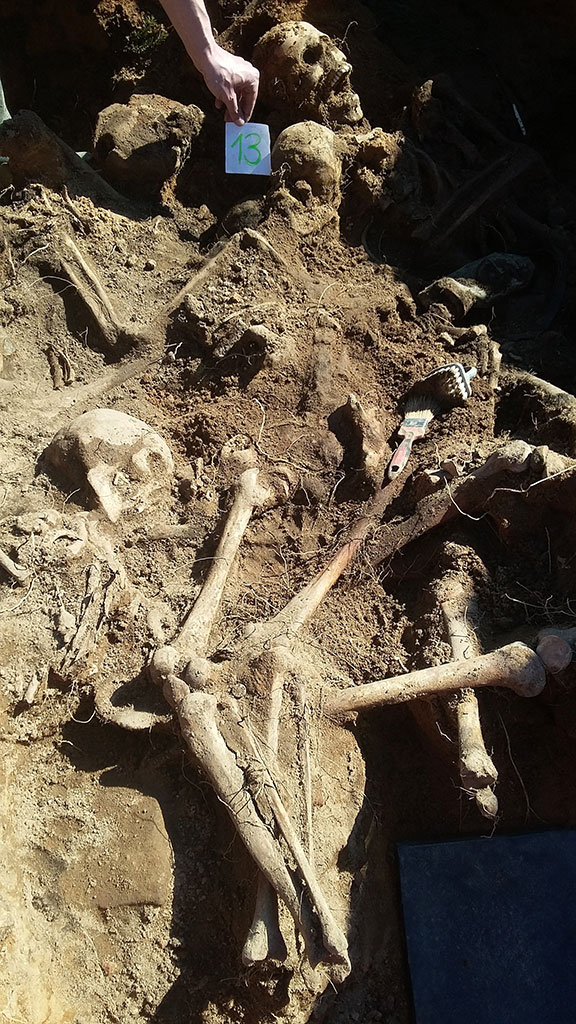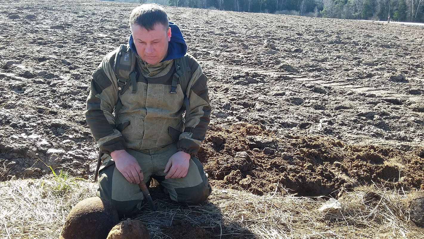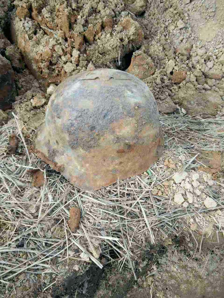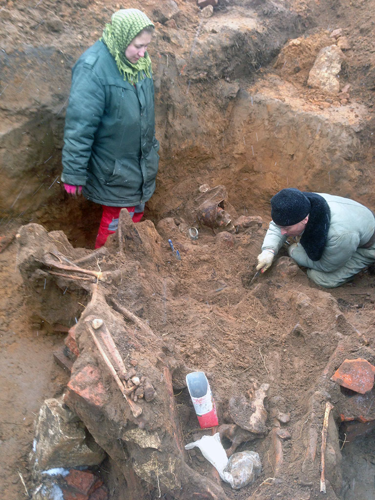 Наиболее сложным этапом оказались работы, проводимые 31 марта и 1 апреля. На глубине до 1,5 метров на небольшой площади были сброшены останки десяти бойцов. Позже в конце траншеи мы наткнулись на воронку, в которой обнаружили останки еще десяти человек и два медальона. Трудностей добавляло то, что останки солдат были завалены землей вперемешку с битым кирпичом и строительным камнем. Тем не менее, удалось персонифицировать каждого из двадцати найденных воинов.