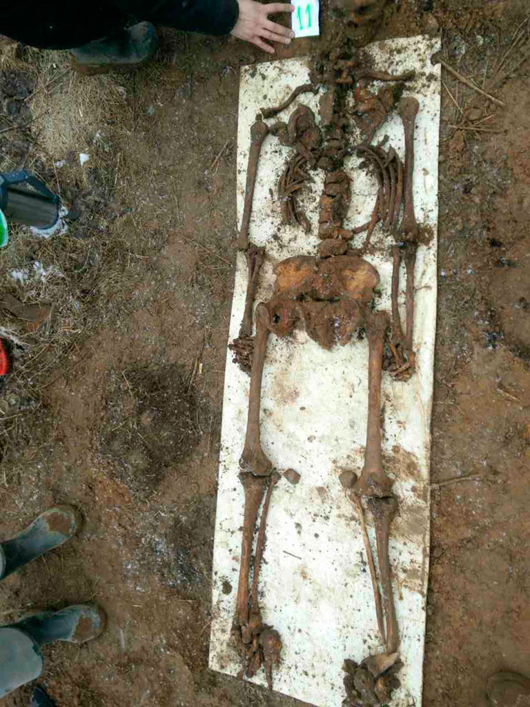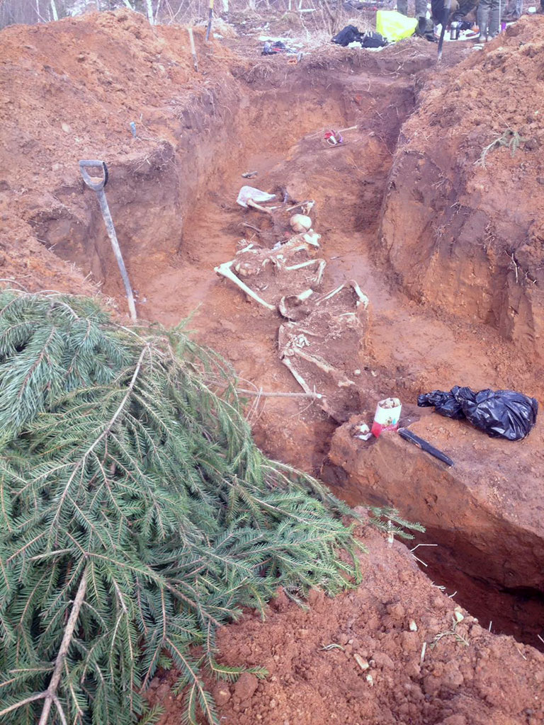 Первый день принес долгожданный результат — на краю поля были найдены останки советского солдата. Дальнейшие эксгумационные работы показали, что в ногах у него находятся останки еще одного воина. С расширением площади раскопа стало понятно, что речь идет не об одном павшем солдате, а о группе бойцов, захороненных в узкой траншее. В течение недели с 26 марта по 2 апреля, несмотря на не простые погодные условия, с утра и до сумерек велся подъем останков археологическим способом. Сначала лопатой вскрывался промерзший грунт, потом совками и кисточкой очищались останки погибших. Из личных вещей и снаряжения солдат были найдены эмалевые звездочки от сгнивших шапок-ушанок, пара ложек, зубная щетка, сгнившая обойма с винтовочными патронами, три противогаза и три ржавые солдатские каски. Обувь отсутствовала.