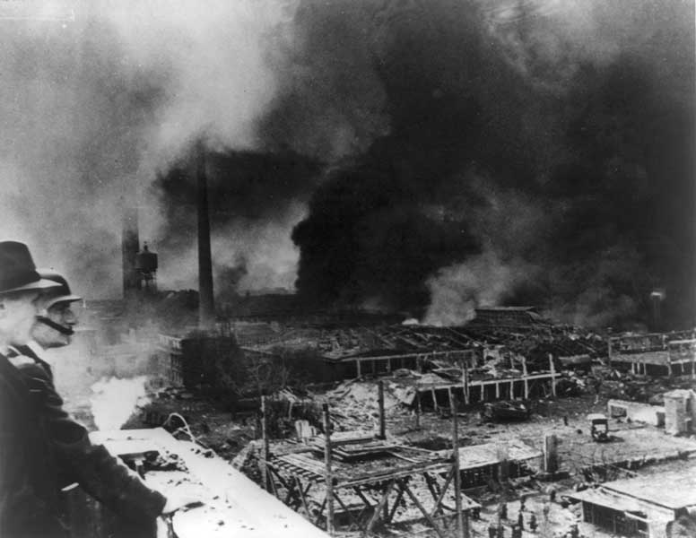 И еще одно свидетельство — рассказывает бывший «остарбайтер» Ю. Хоржемпа: «Первая бомбежка была еще терпимой. Длилась минут десять. А вот вторая — это был уже сущий ад, который, казалось, никогда не кончится. Британцы впервые применили заряды с напалмом. Пожарные пытались тушить это море огня, но ничего не выходило. У меня до сих пор перед глазами: полуголые люди мечутся среди пламени, а с неба с воем падают все новые и новые бомбы...