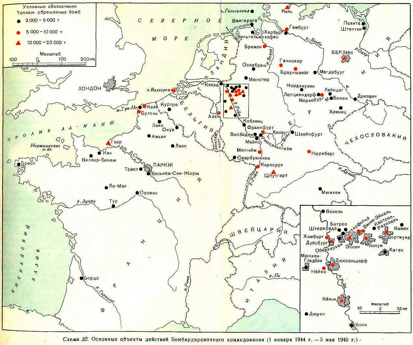 Как 8-я американская армия, так и особенно английское Бомбардировочное командование придерживались плана воздушного наступления на Германию лишь в общих чертах. Английская авиация вместо налетов на важные военно-промышленные объекты основные усилия сосредоточивала на бомбардировке наиболее крупных городов Германии. Главный маршал авиации Харрис 7 декабря 1943 г. заявил, что «к концу октября 1943 г. на 38 главных городов Германии было сброшено 167 230 т бомб, уничтожено около 8400 га застроенной площади, что составляет 25% общей площади городов, подвергшихся нападению».