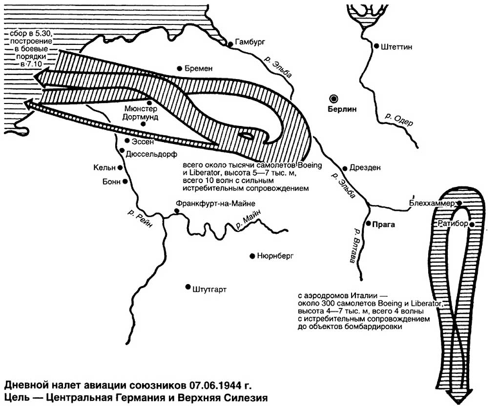 Между тем воздушная бойня шла своим чередом. Летчики Люфтваффе, будучи пока еще хозяевами неба ночью, днем уступали господство в воздухе американцам. Но американская авиация непрерывно наращивала удары. 16 июня налет совершили более 1000 бомбардировщиков в сопровождении почти 800 истребителей, а 20 июня в рейде участвовала 1361 «Летающая крепость». Одновременно другая группа американских самолетов подвергла бомбардировке нефтеперерабатывающие заводы, после чего совершила посадку на территории России в районе Полтавы.