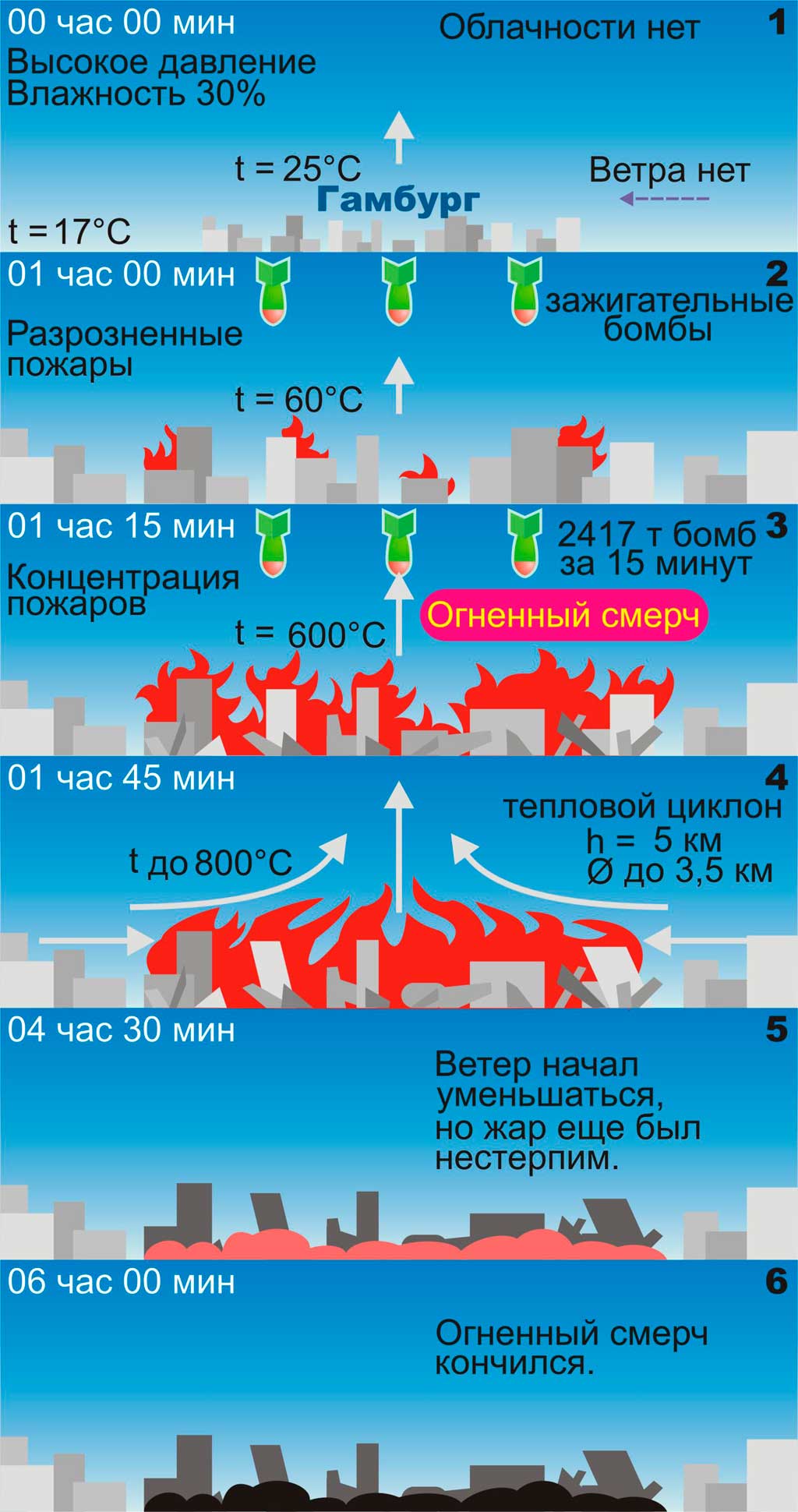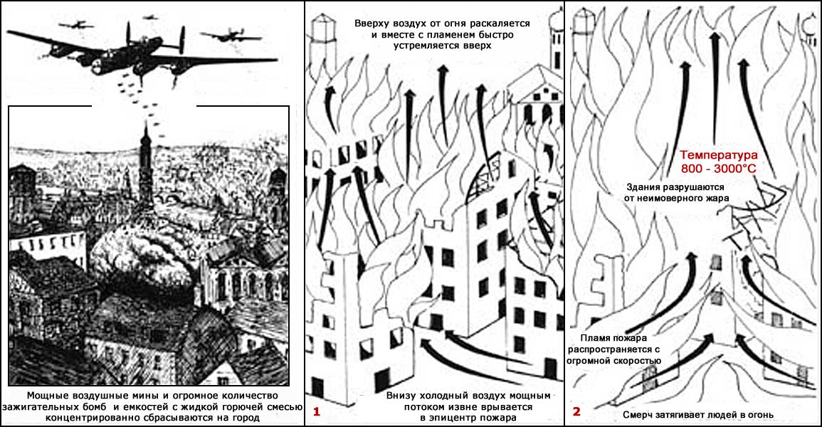 Одновременное возгорание сотен домов создавало на площади нескольких квадратных километров тягу небывалой силы. Весь город превращался в гигантскую печь крематория, засасывающую в себя кислород из окрестностей. Возникающая тяга, направленная в сторону пожара, вызывала ветер, дующий со скоростью 200–250 км/ч, гигантский пожар высасывал кислород из бомбоубежищ, обрекая на смерть даже тех людей, кого пощадили бомбы.