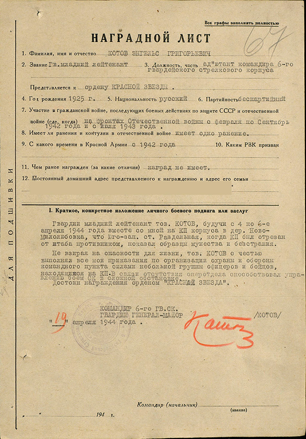 Сложно судить, что побудило уважаемого героя-фронтовика заменять факты художественным вымыслом. Возможно, автор хотел усилить эмоциональное воздействие на читателя, придав своим мемуарам некоторые черты художественного произведения. Или же просто вспомнил и пересказал историю, которую услышал тогда же (707-й штурмовой авиаполк из состава 186-й штурмовой авиадивизии, в котором воевал Николай Александрович Шмелёв, располагался рядом с 866-м истребительным полком). Наверняка летчики «по-соседски» обсуждали между собой этот незаурядный случай, который постепенно обрастал множеством вымышленных подробностей, превращаясь в очередную фронтовую легенду. Вообще сомнительно, чтобы лейтенант-летчик мог знать фамилию командира стрелкового корпуса, чьи маршевые колонны случайно проходили поблизости. Так или иначе, но образ реального генерала Котова растворился в мифическом образе генерала Степанова. Хотя, если разобраться, Н. А. Шмелёв ненамного отступил от истины: генерал-лейтенант Г. П. Котов действительно умер на руках своего сына: младший лейтенант Энгельс Котов был не только старшим сыном генерала, но и его адъютантом.23 Кстати, сохранился подписанный генералом Котовым наградной лист, где он представляет своего сына-адъютанта к награде за апрельские бои.