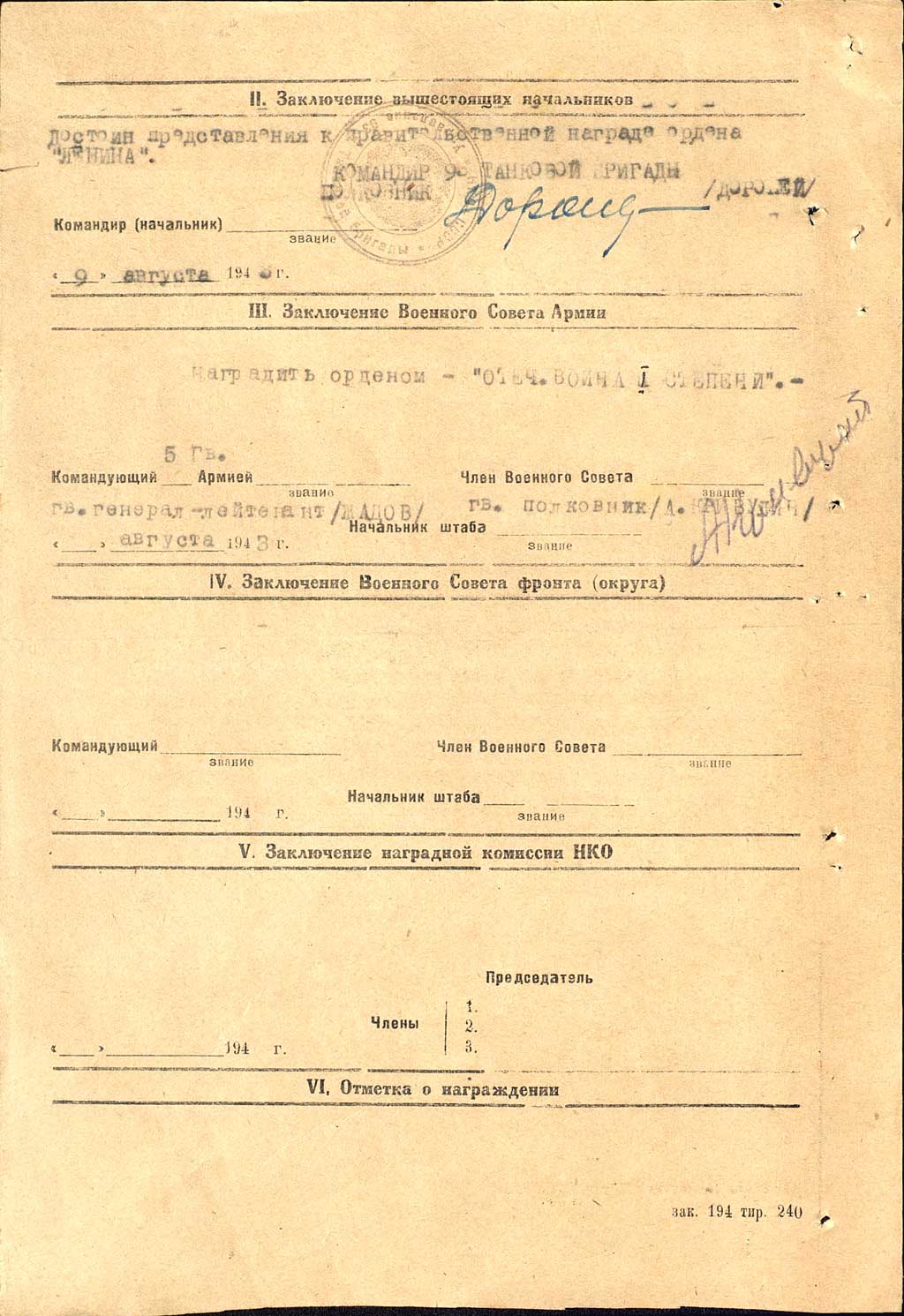 Таким же орденом был награжден командир роты А. М. Елизаров, хотя комбриг Доропей представлял его к «солдатскому» полководческому ордену Александра Невского — Елизаров, грамотно управляя ротой и лично участвуя в атаке, сумел продвинуться вперед не на пять, а на восемь километров. И только командиры обоих танковых батальонов бригады (один из комбатов был ранен), благодаря ходатайству командующего БТ и МВ 5 гв. армии, получили ордена Красного Знамени, к которым и представлял их командир бригады полковник С. К. Доропей. Что же касается самого Доропея, то каким-то непостижимым образом он вообще не попал в список награжденных. И это при том, что за отличное выполнение боевой задачи командир 93 отбр удостоился личной благодарности заместителя командующего Воронежским фронтом генерала армии И. Р. Апанасенко! Лишь в середине сентября справедливость была восстановлена: по представлению командующего 27 армии, в чье подчинение перешла бригада, Сергей Клементьевич Доропей за прорыв немецкой обороны 3 августа был награжден орденом Красного Знамени.