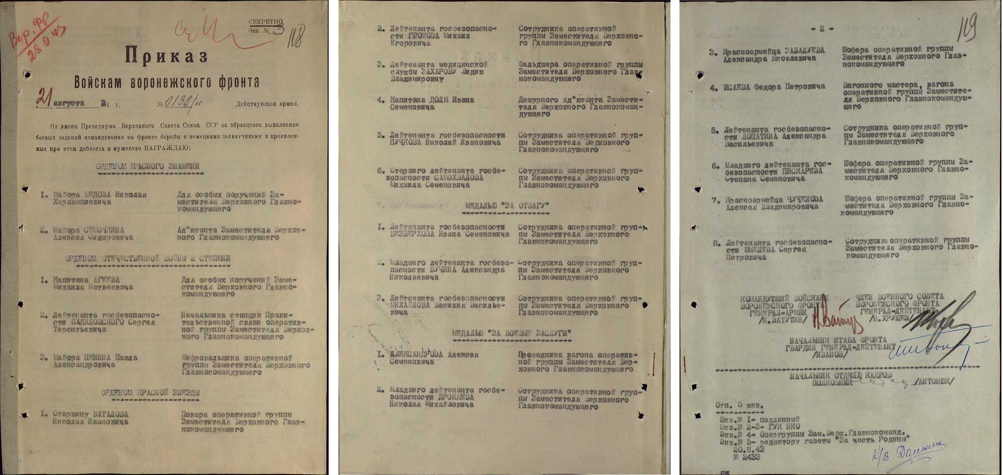 Однако распределение наград по принципу «даю, кому хочу» продолжалось. Показательный пример подобного произвола — приказ войскам Воронежского фронта № 0130/н от 21.08.1943 г. за подписями командующего фронтом генерала армии Н. Ф. Ватутина, члена ВС фронта генерал-лейтенанта Н. С. Хрущева и НШ фронта генерал-лейтенанта С. П. Иванова. Читаем четкие и торжественные строки приказа: «От имени Президиума Верховного Совета СССР за образцовое выполнение заданий командования на фронте борьбы с немецкими захватчиками и проявленные при этом доблесть и мужество, награждаю...»