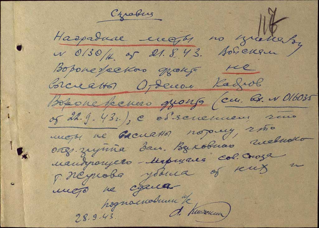 В этом деле вы не найдете ни одного наградного листа с описанием подвигов награжденных. И не потому, что документы утрачены или информация секретна. Нет, просто командование фронта решило порадовать маршала и без «лишних» формальностей быстро подмахнуло незаконный приказ № 0130/н, который пролился на его «героическую» челядь приятным дождем орденов и медалей. Доказательством неправомерности этого приказа служит маленькая справочка, сохранившаяся в наградном деле. В ней говорится, что убывшая восвояси опергруппа Жукова не возжелала сдать наградные листы. Поэтому совершенно непонятно, на основании чего Военный совет фронта утверждал награждения за несуществующие подвиги. И все это безобразие творилось от имени Президиума Верховного Совета СССР. К сожалению, подобная несправедливость будет преследовать К. И. Байду даже после гибели.