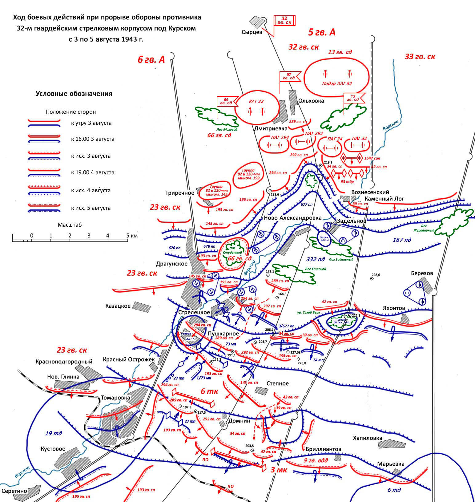 На основе решения командующего 5 гв. А генерал-лейтенанта Жадова А. С., принятого 27 июля 1943 г., 32 гв. стрелковый корпус в составе 13, 97 и 66 гв. стрелковых дивизий, действуя в первом эшелоне армии, получил задачу прорвать оборону противника на фронте (иск.) Драгунское, выс. 233,6, Каменный Лог, овладеть рубежом северная окраина Стрелецкое, отм. 184,3, выс. 222,3; в последующем выйти на рубеж Пушкарное, выс. 191,1, выс. 225,48 и обеспечить с него ввод в прорыв 1 танковой армии. К исходу дня корпус должен был выйти на рубеж Томаровка, Домнин.