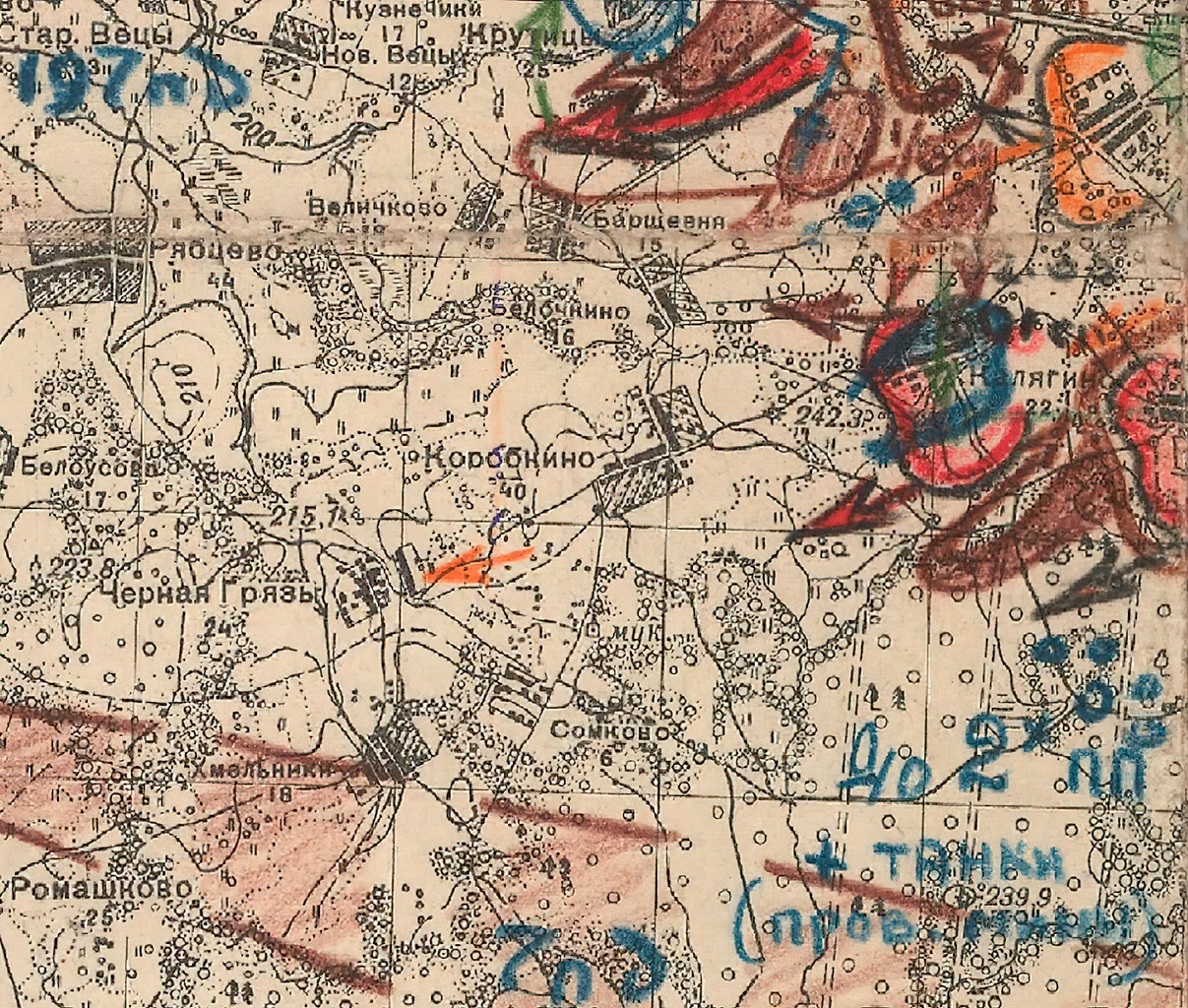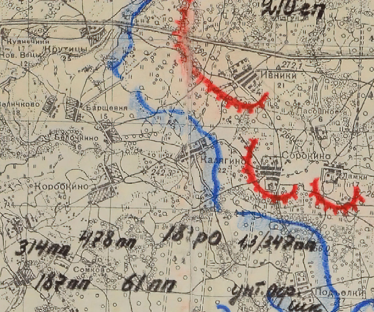 Во-первых, в боевом донесении № 87 от 26 февраля, описывая вражескую группировку, штадив указал, что в районе населенных пунктов Коренное, Афанасьевка и Сгилево, то есть на правом фланге дивизии (позиции 1310-го полка), обороняются подразделения 472-го пехотного полка (далее пп — прим. В. Н.) из 252-й пехотной дивизии (далее пд — прим. В. Н.) вермахта. На левом фланге дивизии, в районе Подъелки и Ощепково (позиции 601-го полка) предположительно оборонялись подразделения 347-го пп из 197-й пд. А вот про вражескую группировку в районе Крутицы, Борщевни и Калягино, где был центр обороны 82-й мсд с позициями 210-го полка, не было никаких уточнений. Лишь только то, что там находятся до двух батальонов пехоты без их идентификации.