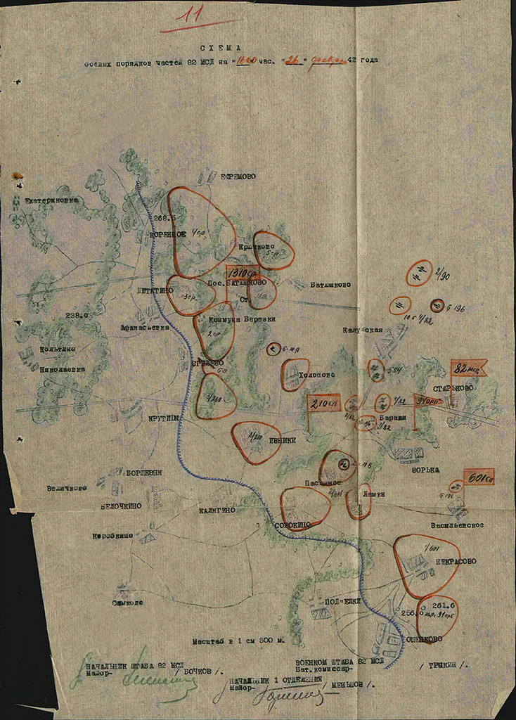Интересующее нас событие произошло в ночь с 24 на 25 февраля 1942-го, когда 6-я рота 210-го мотострелкового полка (далее мсп — прим. В. Н.) проводила разведку боем. К сожалению, не удалось найти приказ на ее осуществление. Единственным обнаруженным приказом штаба 82-й мсд стал документ № 021 от 19-го февраля, которым комдив полковник А. И. Акимов велел своим частям к 21 февраля подготовить оборону на рубеже соприкосновения с противником, удерживающим населенные пункты Коренное, Афанасьевка, Сгилево, Крутицы, Борщевня, Белочкино, Калягино, Подъелки и Ощепково. В частности, 210-му мсп он приказал следующее:1