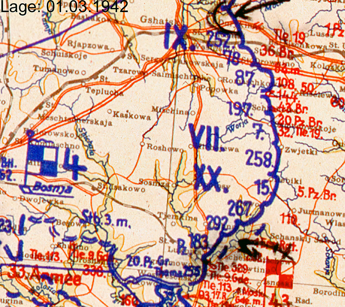 В конце февраля 1942-го противником 5-й А юго-восточнее Гжатска был 9-й армейский корпус (далее АК — прим. В. Н.) вермахта. Персонально против дивизии Акимова действовала 87-я пд генерала В. Лухта. и 78-я пд генерала П. Фолькерса. Части последней удерживали Калягино. Отмечая нападение группы Колесниченко в ночь на 25 февраля, штаб 9-го АК сделал в журнале боевых действий (далее ЖБД — прим. В. Н.) следующую пометку: