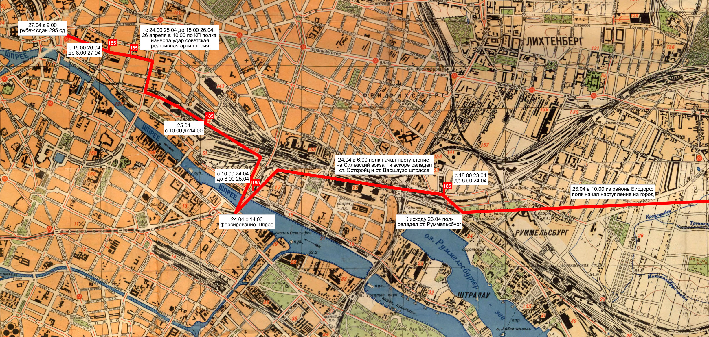 В 10-00 23 апреля 1945 г. 185-й гвардейский стрелковый полк перешел в наступление и, миновав Карлсхорст, к исходу дня овладел ст. Руммельсбург. В 6-00 следующего дня по приказу командира дивизии полк начал наступление на Силезский (ныне Восточный) вокзал. После того, как были захвачены станции Осткройц и Варшауэр штрассе, полку была поставлена новая задача. Изменив маршрут движения, полк вышел к р. Шпрее в районе Варшауэр штрассе и в 14-00 начал форсирование реки по мосту.