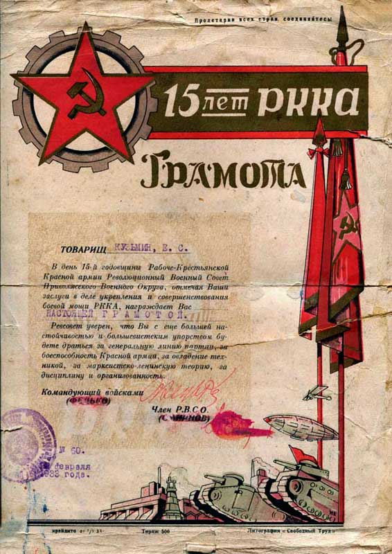 В начале тридцатых годов Е. С. Кузьмин проходил службу в войсках Приволжского военного округа, о чем свидетельствует Грамота, которой он был награжден в ознаменование 15-летия РККА.