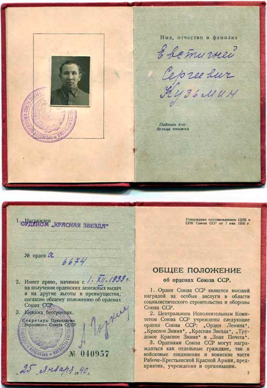 С 15 июля по 17 сентября 1939 года начальник 2-й части 82 стрелковой дивизии капитан Кузьмин Е. С. участвовал в боях у реки Халхин-Гол. За мужество и стойкость Указом ПВС СССР от 17.11.1939 г. был награжден орденом Красной Звезды.